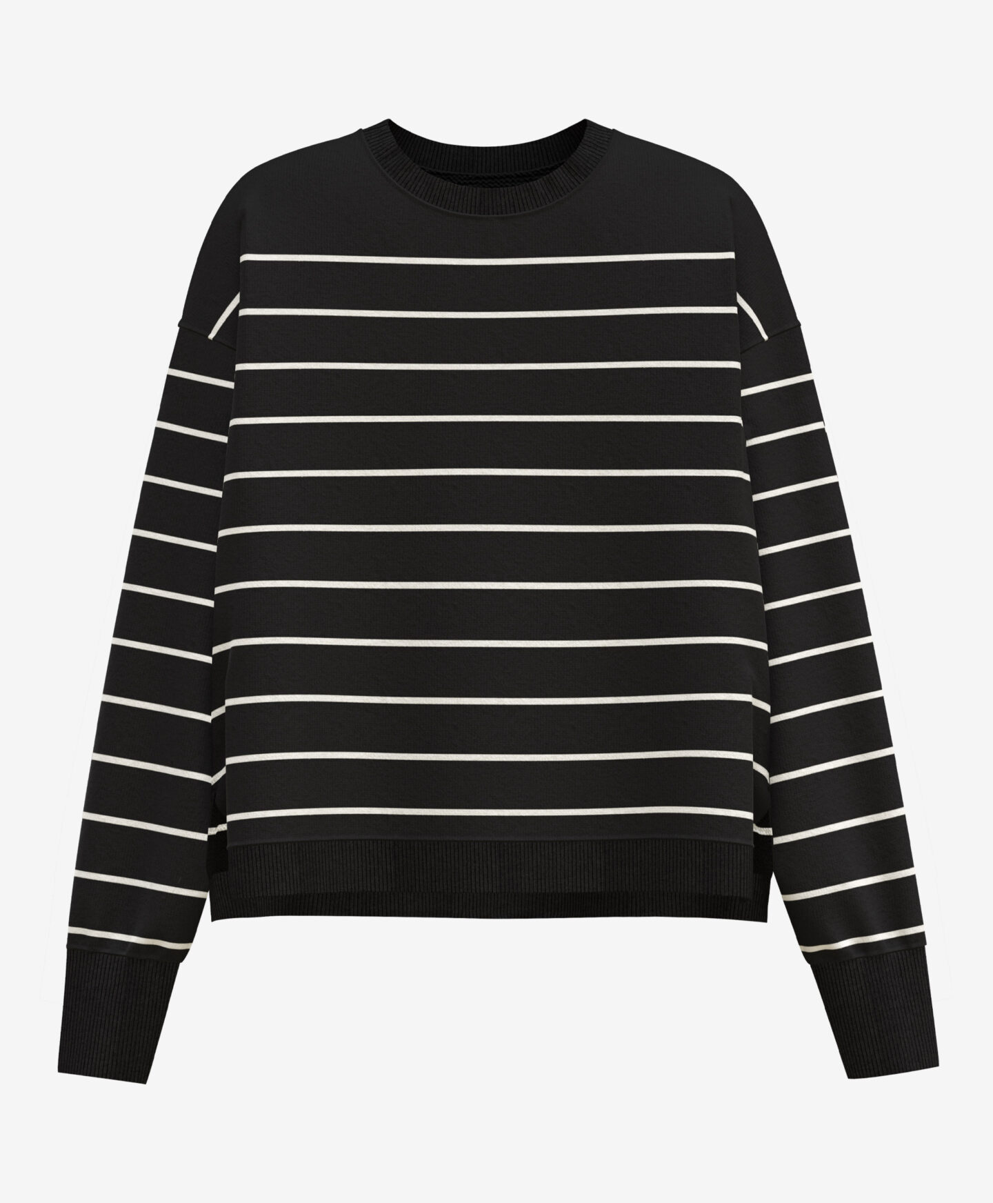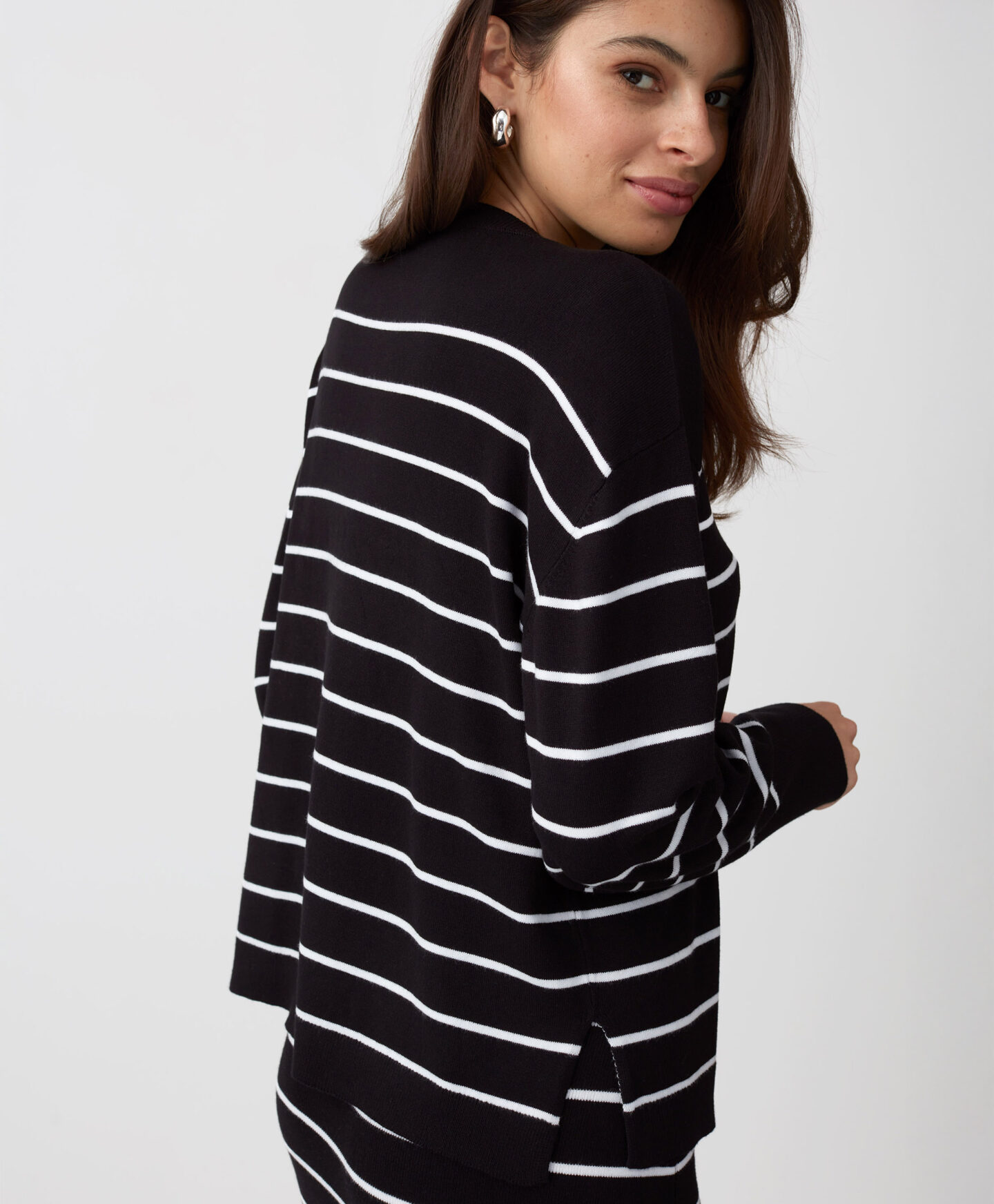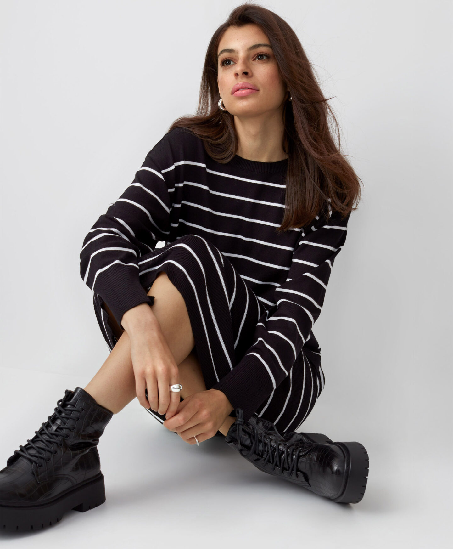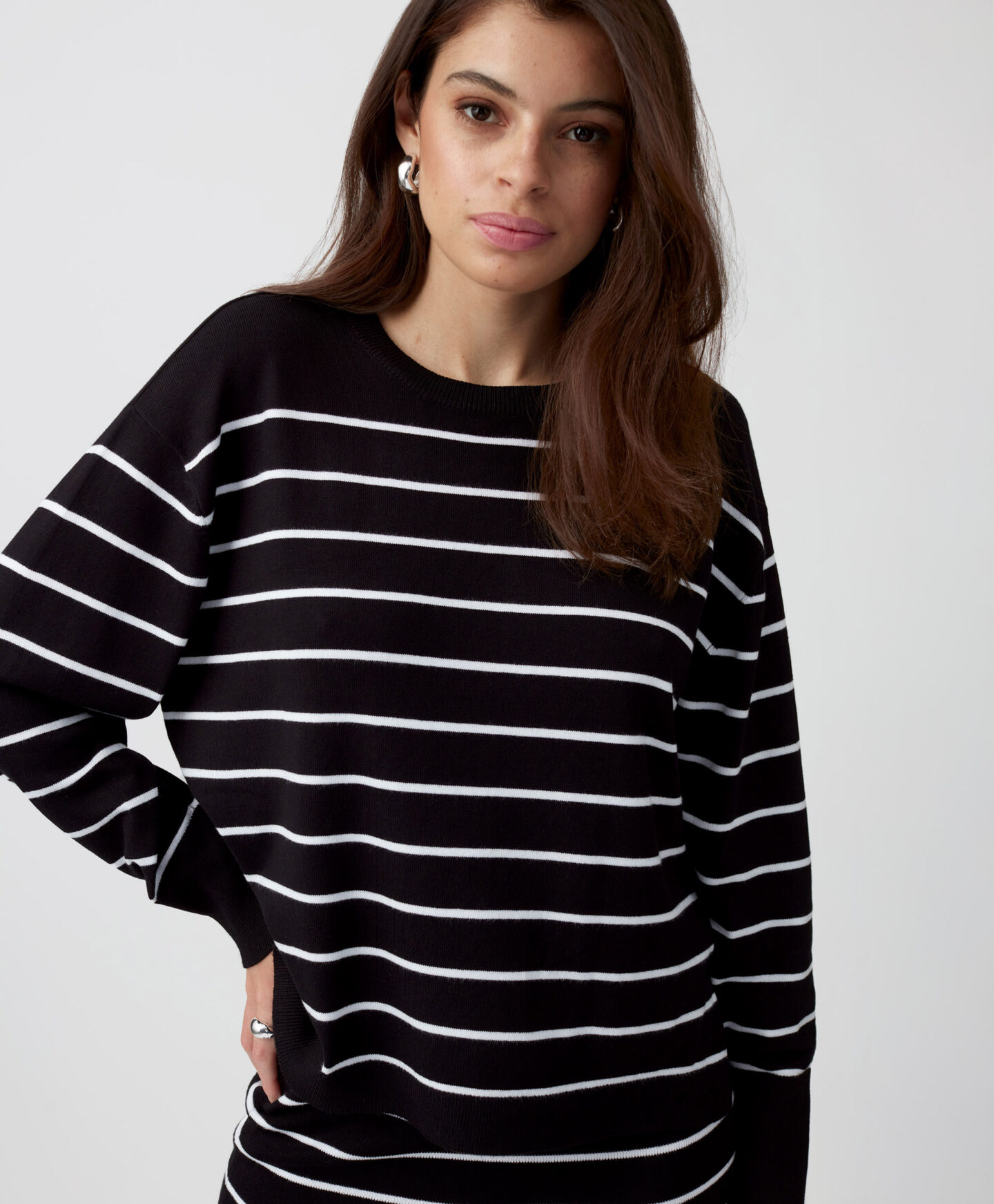 Svītrains džemperis lieliski izskatās ar tāda paša raksta svārkiem, kas arī ietilpst piedāvājumā. Džemperis ir viegls, gaisīgs un patīkami ieskauj ādu. Tas skaisti “krīt”, padarot šo džemperi par lielisku izvēli gan brīvajam laikam, gan ofisa vai skolas apmeklējumam. Svītrainais raksts ir vienmēr aktuāls un nekad neiziet no modes.