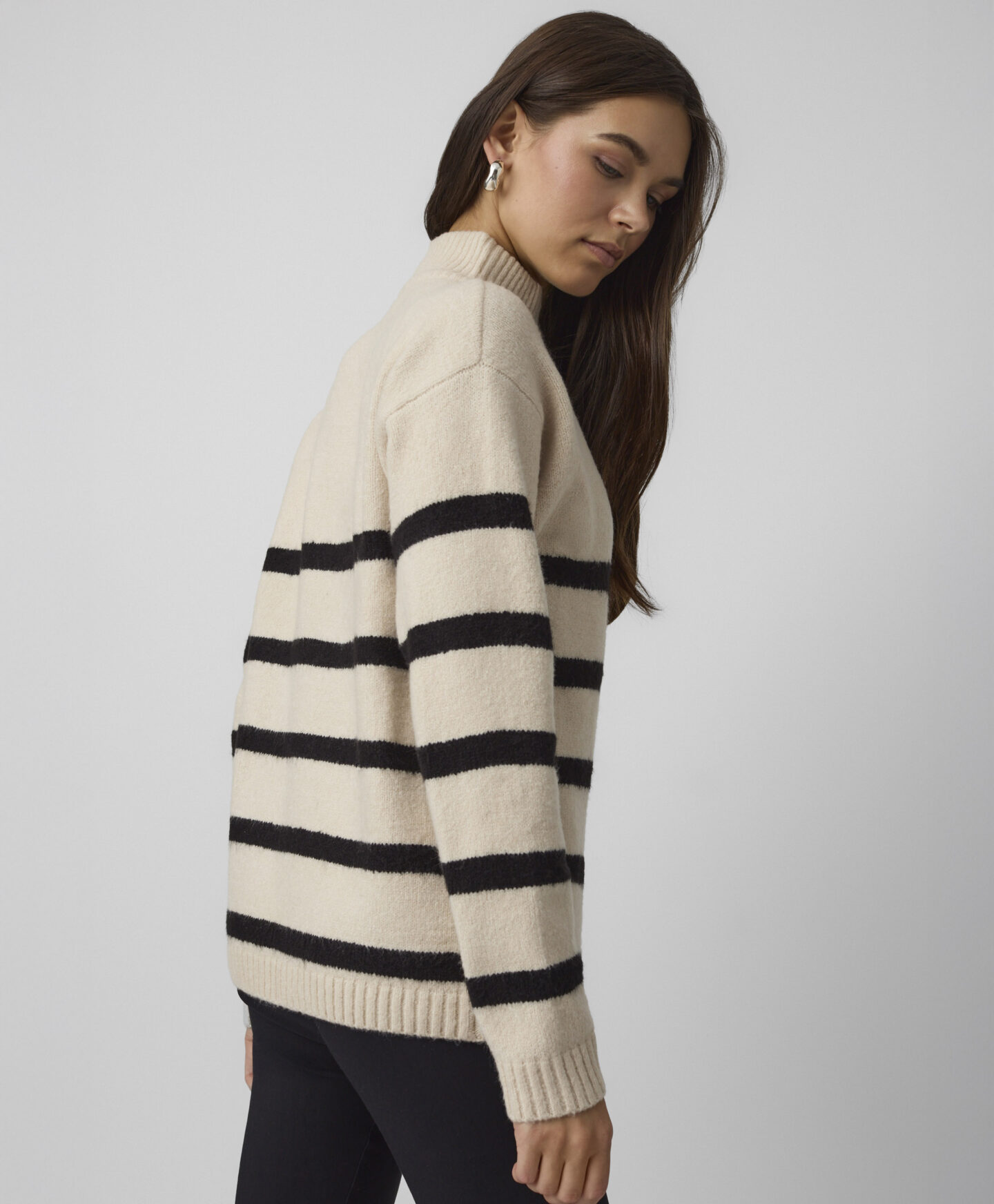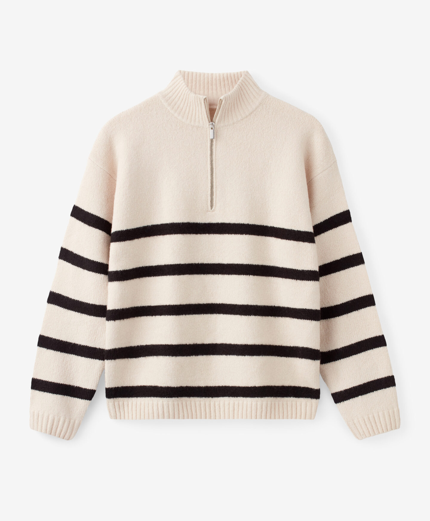 Svītrainais džemperis, kas ir aiztaisāms ar rāvējslēdzēju kakla daļā, ir ideāla izvēle ikvienam, kas novērtē klasisku stilu ar mūsdienu pieskārienu. Tas ir silts, mīksts, patīkams pieskārienam, ideāli piemērots rudens pirmajām drēgnajām dienām. Vienmēr aktuālais svītru raksts piešķir eleganci jebkuram tērpam un nekad neiziet no modes.