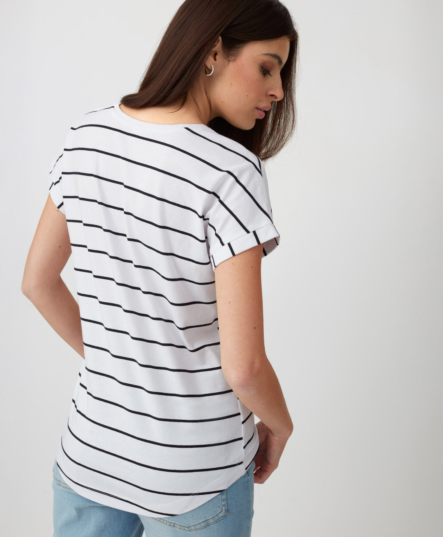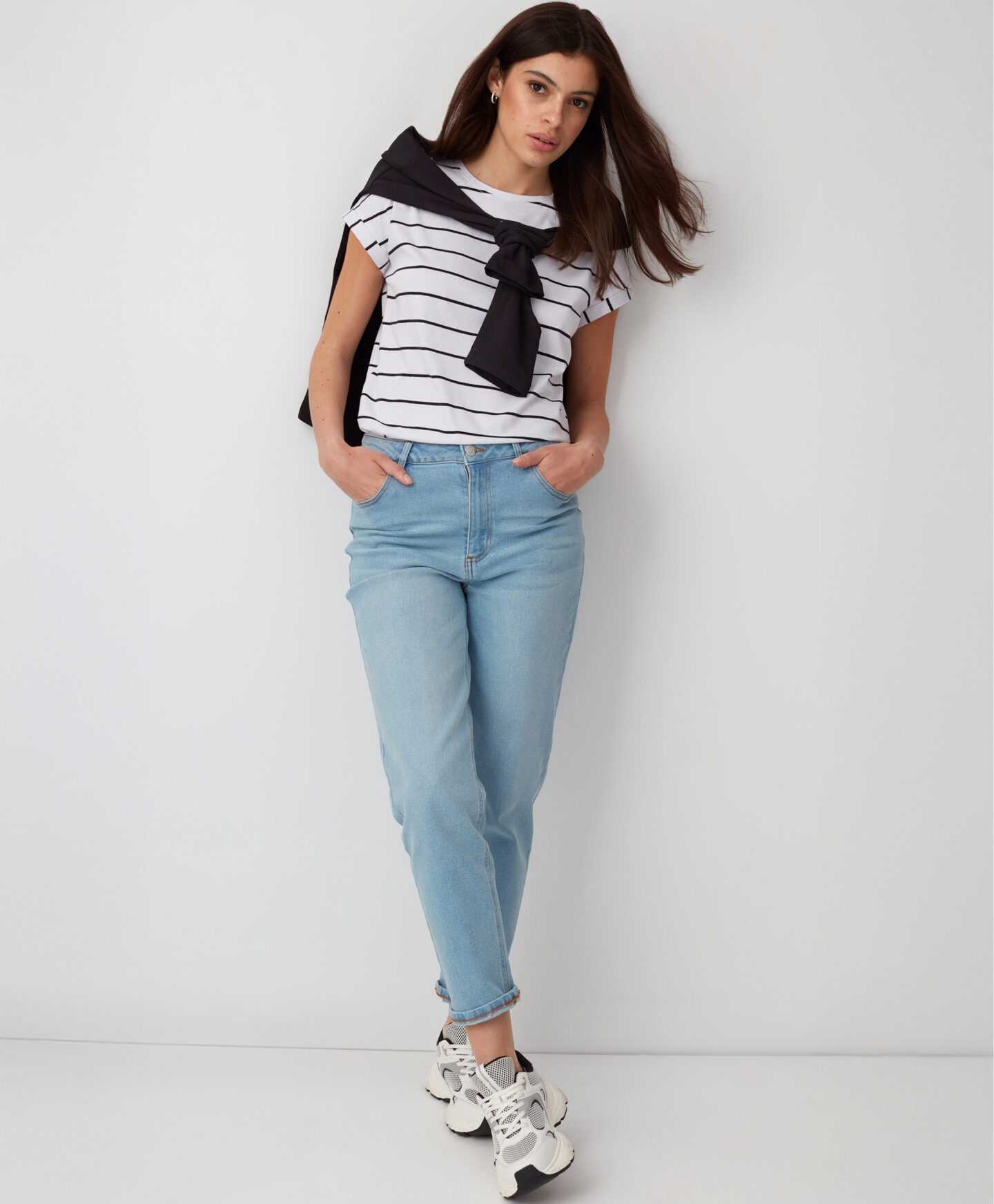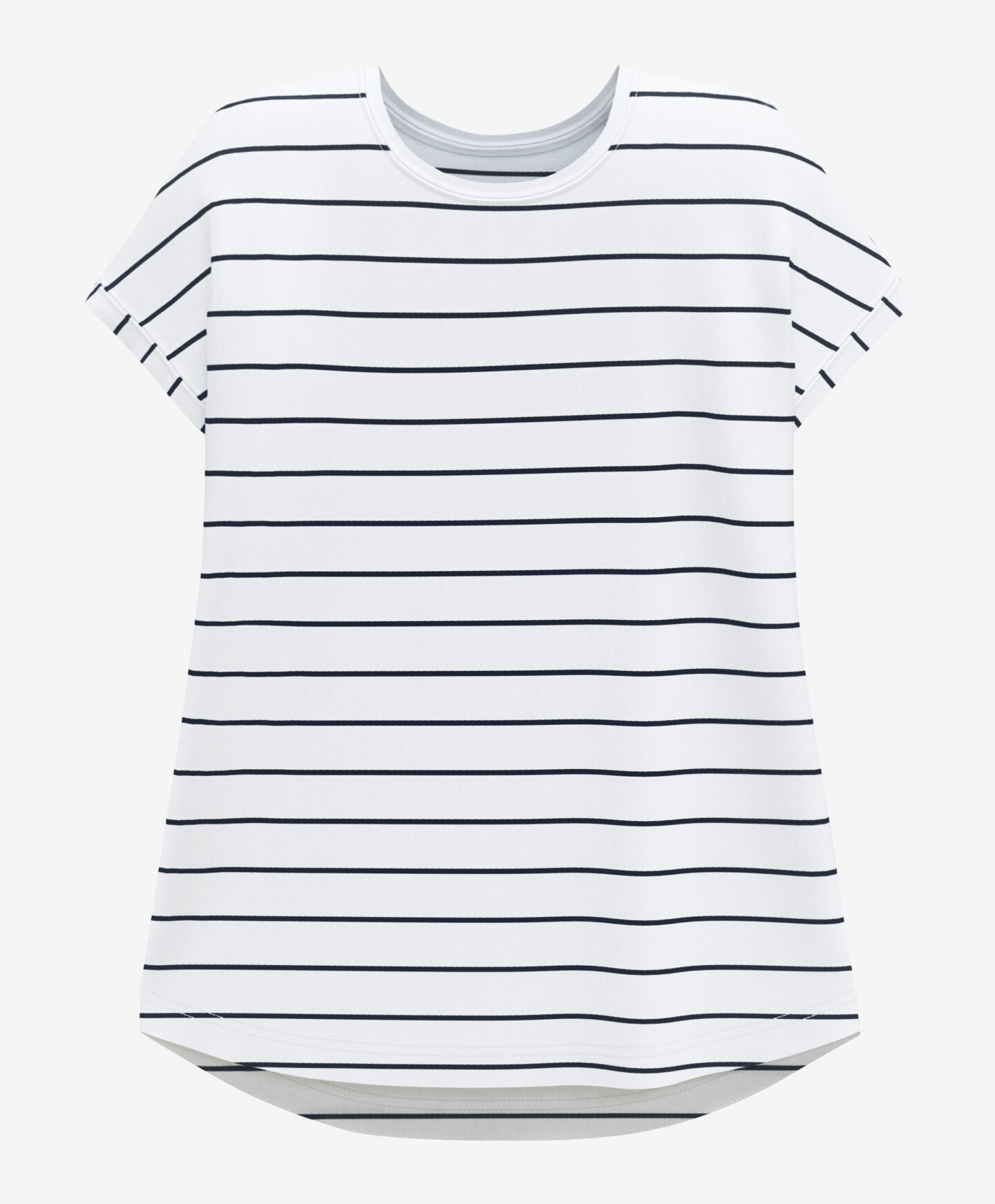 Svītrains T-krekls, kas izgatavots no 100% kokvilnas, ar īsām piedurknēm ir klasisks garderobes elements, kas noderēs dažādās situācijās. Dabiskais materiāls nodrošina komfortu. Tas ir arī elpojošs, tāpēc T-krekls ir ideāla izvēle siltākās dienās.