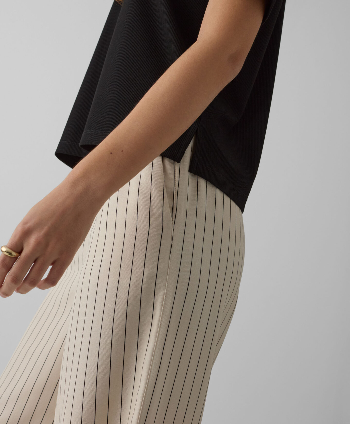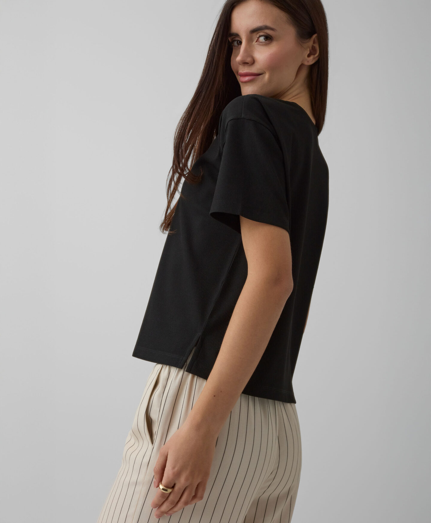 Svītrainajam T-kreklam ar 3/4 piedurknēm ir rievota struktūra, kas piešķir raksturu jebkuram tērpam. Klasiskais, svītrainais raksts nekad neiziet no modes, savukārt ērtais piegriezums padara šo T-kreklu tik iecienītu! Kreklu var kombinēt ar džinsiem, bet arī ar sporta biksēm, atpūšoties mājās.
