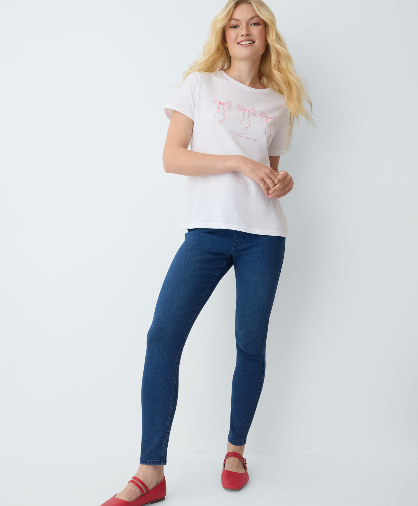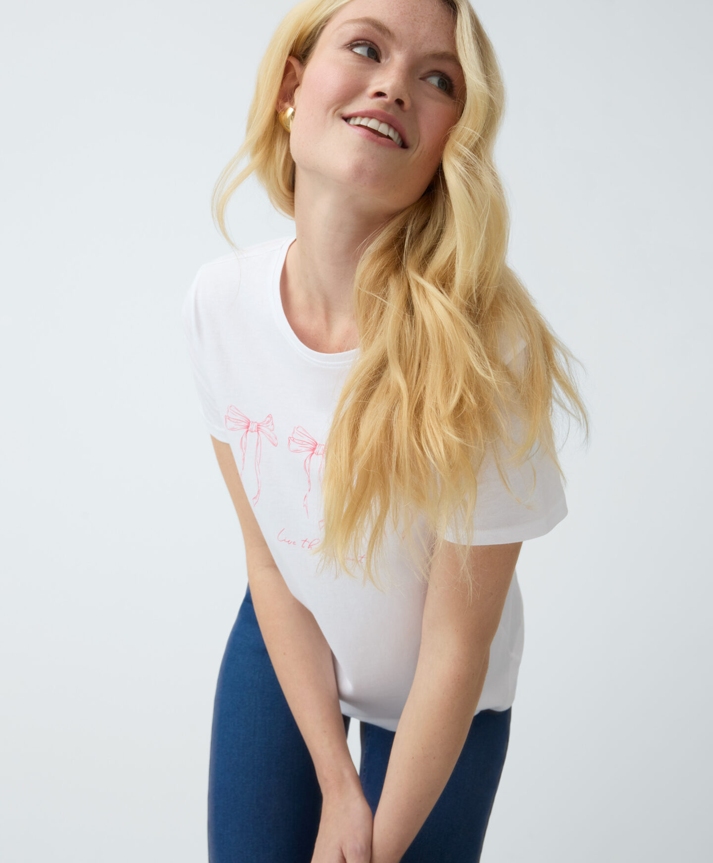 T-krekls, kas izgatavots no 100% kokvilnas, ar apdruku priekšpusē, ir lieliski piemērots komforta cienītājiem. Mīkstais materiāls maigi apņems ādu, un universālā krāsa ļauj izveidot daudz veiksmīgu tērpu. Tas lieliski izskatās zem džempera vai kardigana. Apvienojumā ar klasiskām džinsa biksēm tas rada ideālu tērpu gan birojam, gan universitātei.