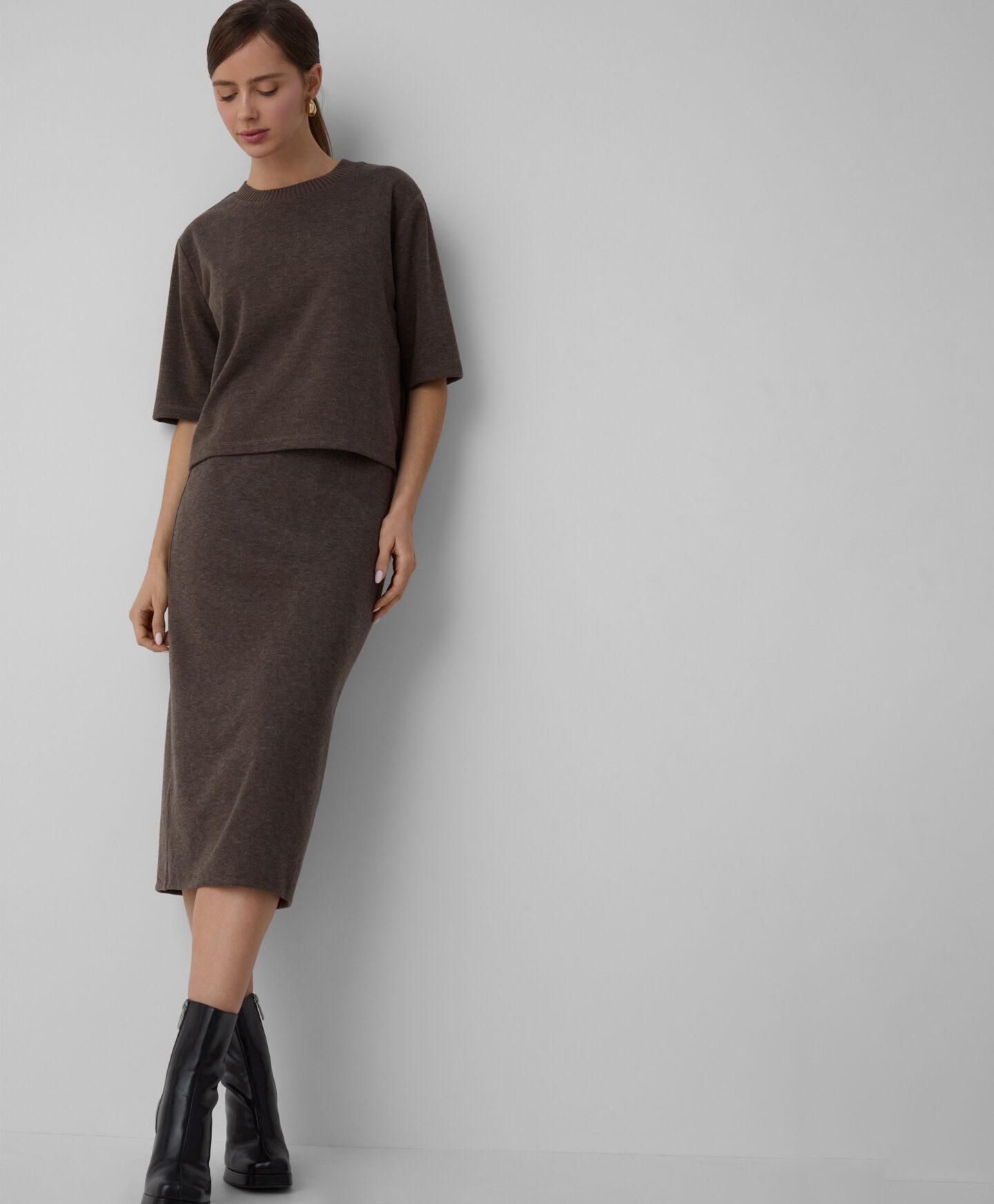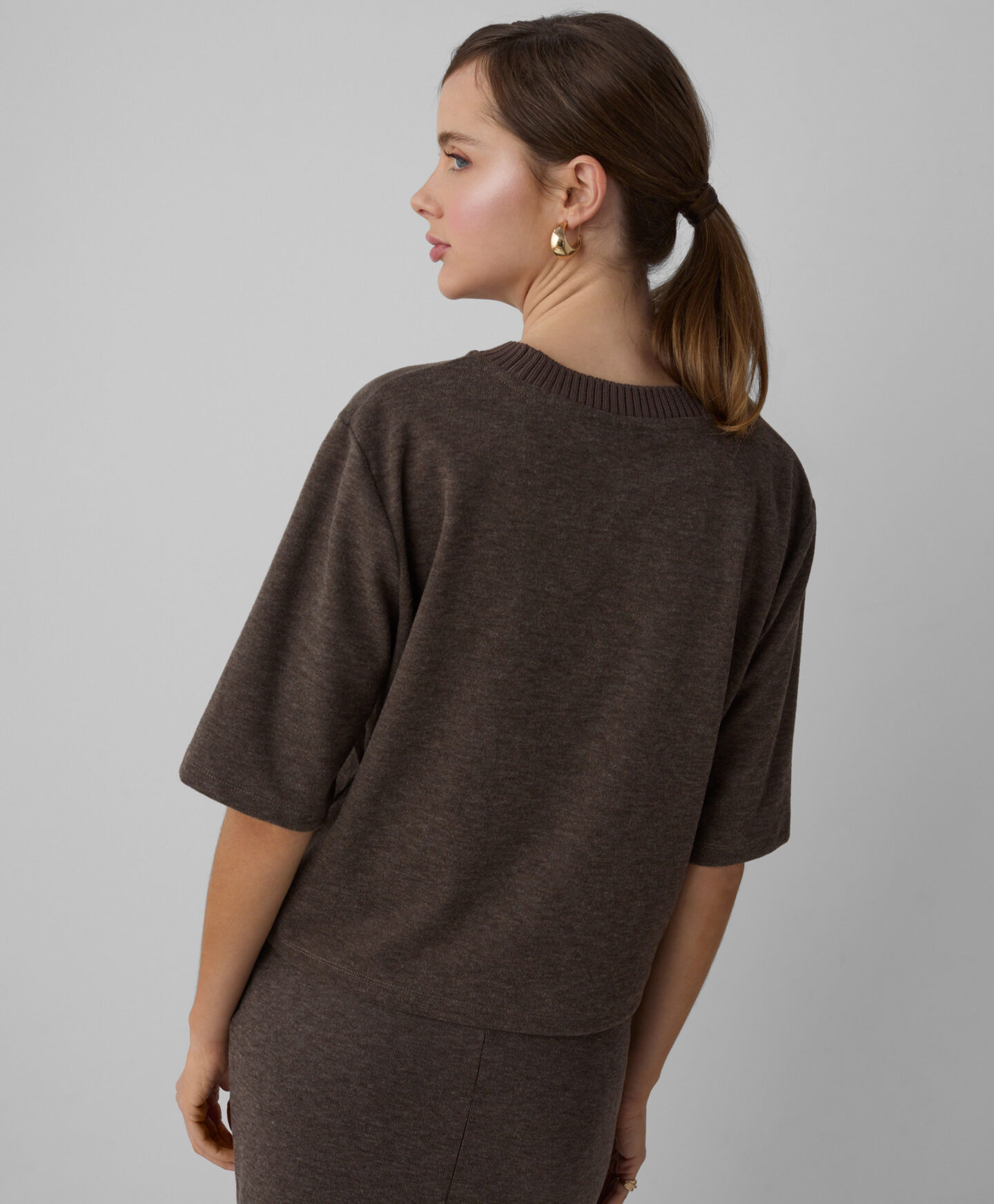 T-krekls ar džempera apdari perfekti sader ar brūnajiem midi svārkiem un biksēm no mūsu kolekcijas. Brīvais piegriezums nodrošina kustību brīvību un komfortu. Džempera materiāls piešķir raksturu jebkuram apģērbam, radot stilīgu efektu. Tumši brūnā krāsa perfekti iederas rudens / ziemas noskaņā.