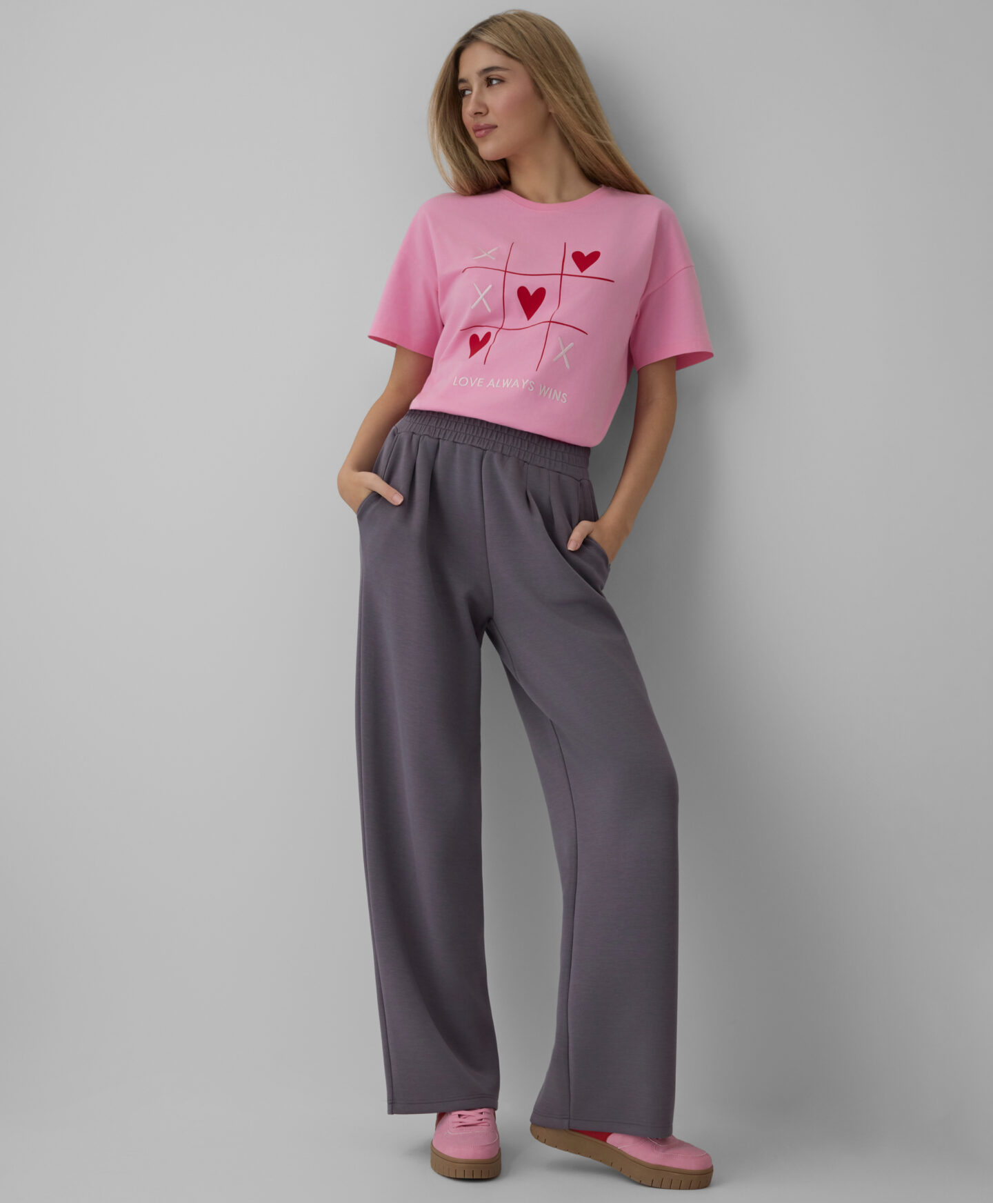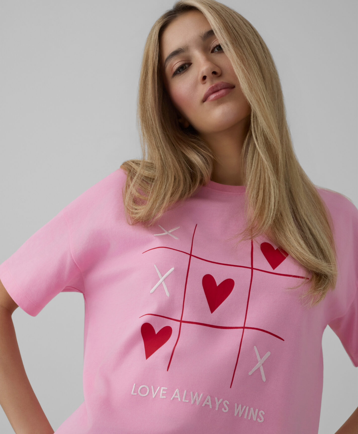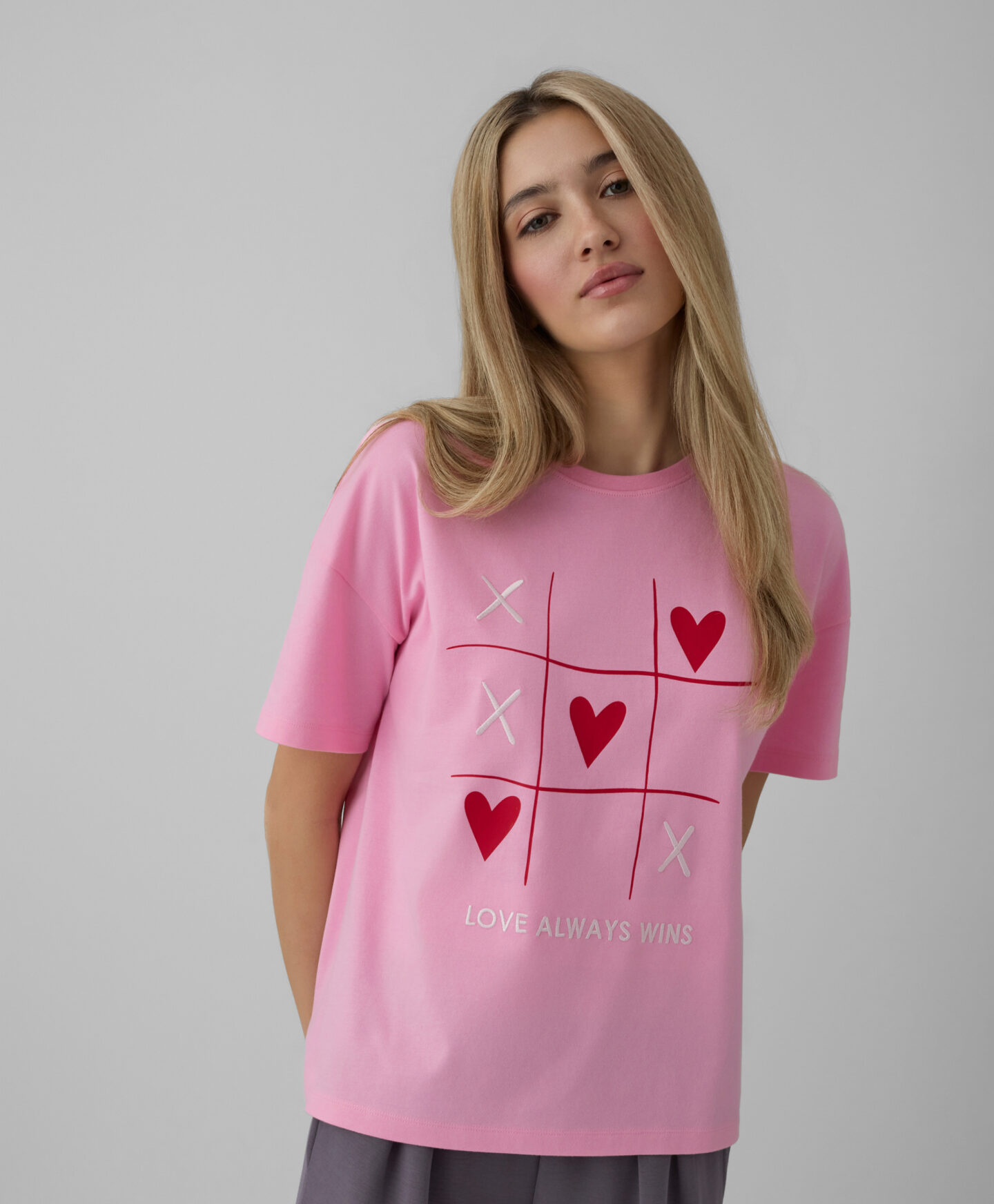 T-krekls ar sirdīm, izgatavots no 100% kokvilnas, ar īsām piedurknēm, ir lieliska izvēle ikdienas valkāšanai. T-krekls ir ļoti universāls. Mīkstais un elpojošais audums nodrošina valkāšanas komfortu, bet pievilcīgais sirsniņu raksts piešķir romantisku noskaņu jebkuram tērpam.