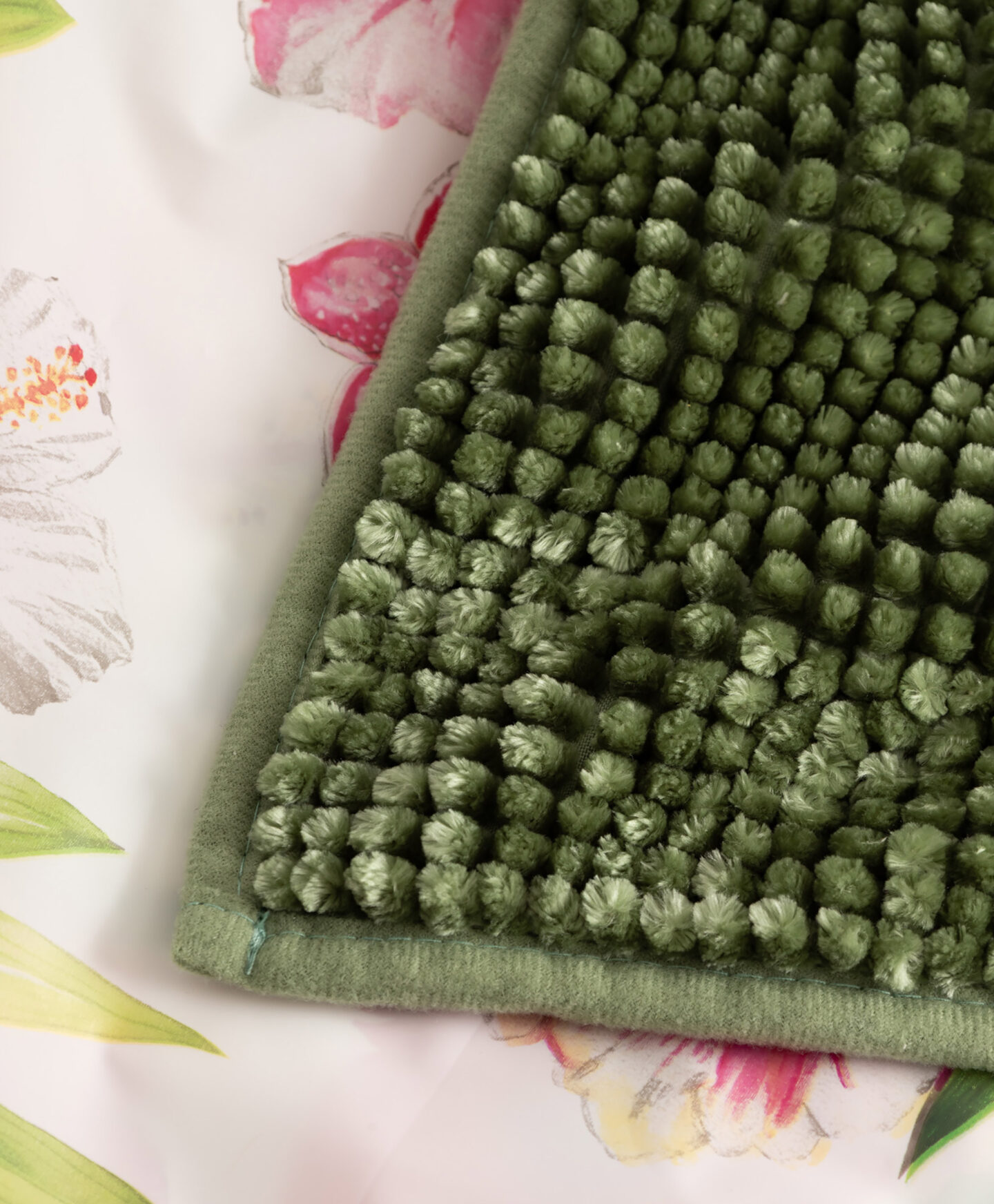 Šis vannas istabas komplekts ir ātrs veids, kā atdzīvināt savu vannas istabu un radīt relaksējošu atmosfēru. Paklāja zaļā krāsa un aizkars ar hibisku rakstu organizē telpu un piešķir tai modernu botānisku vai urbāno džungļu noskaņu. Aizkars ir izgatavots no ūdensizturīga, ātri žūstoša materiāla un efektīvi pasargā vannas istabu no ūdens šļakatām. Mīkstais, pūkainais paklājs ir neticami patīkams uz tausti.