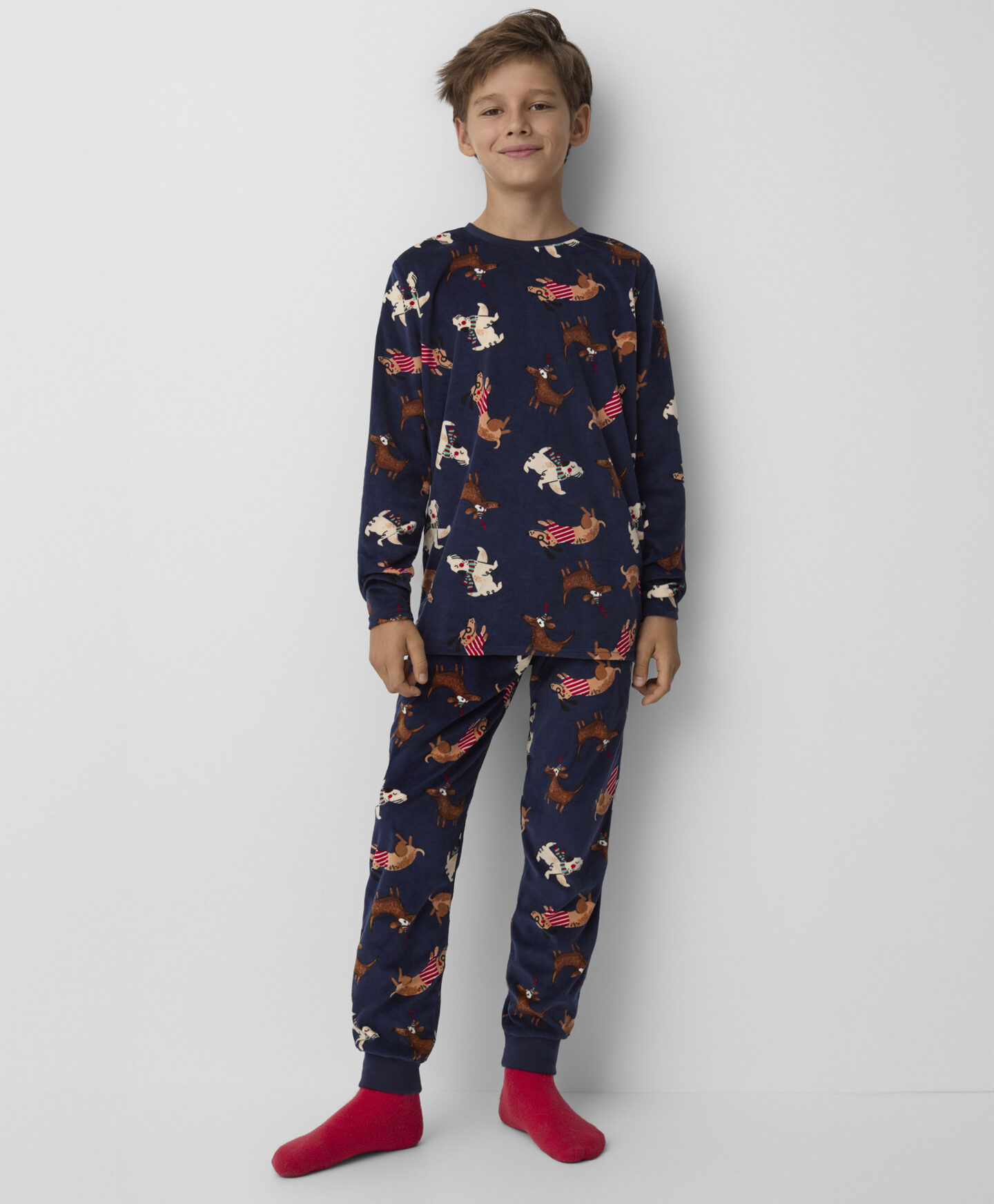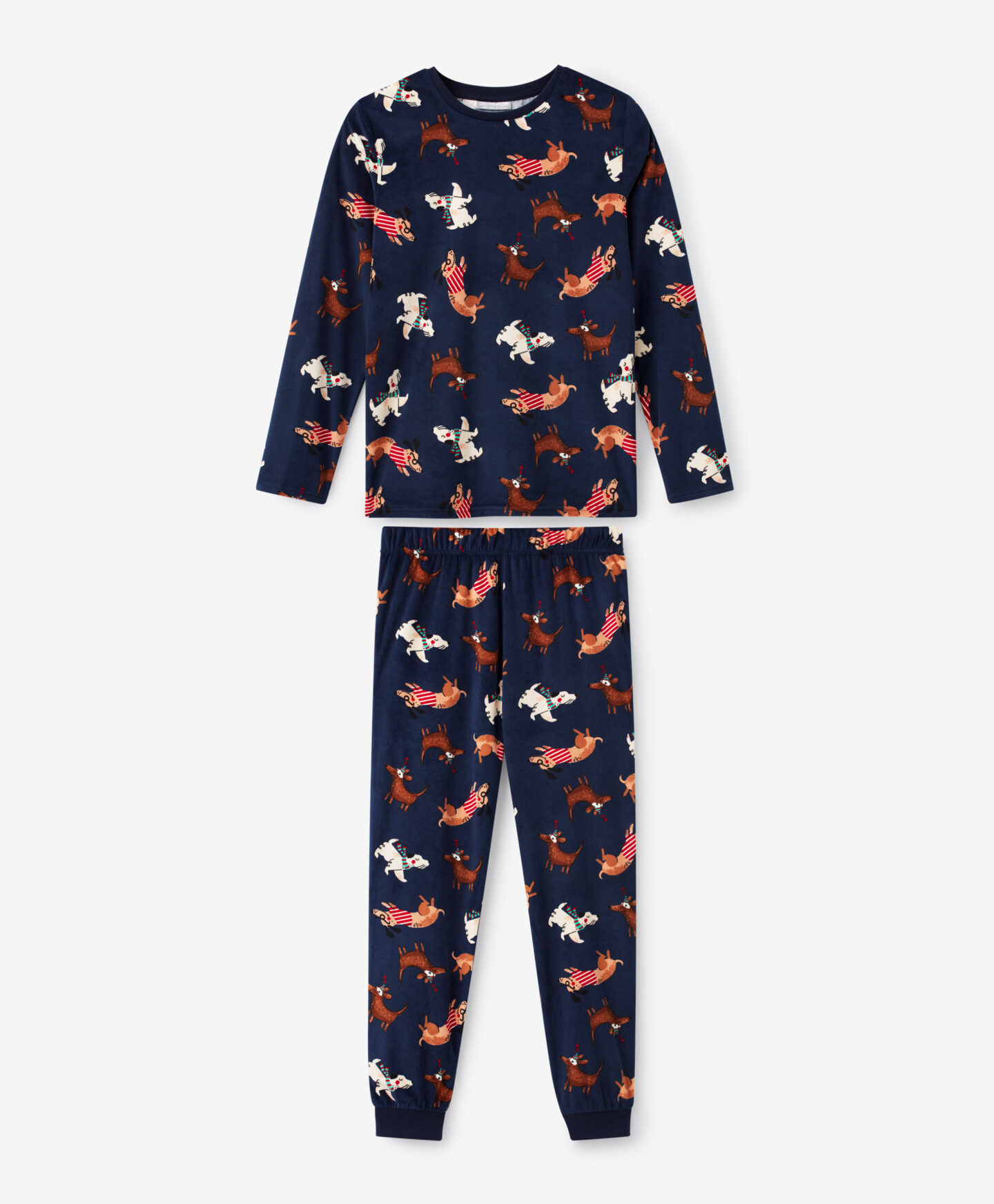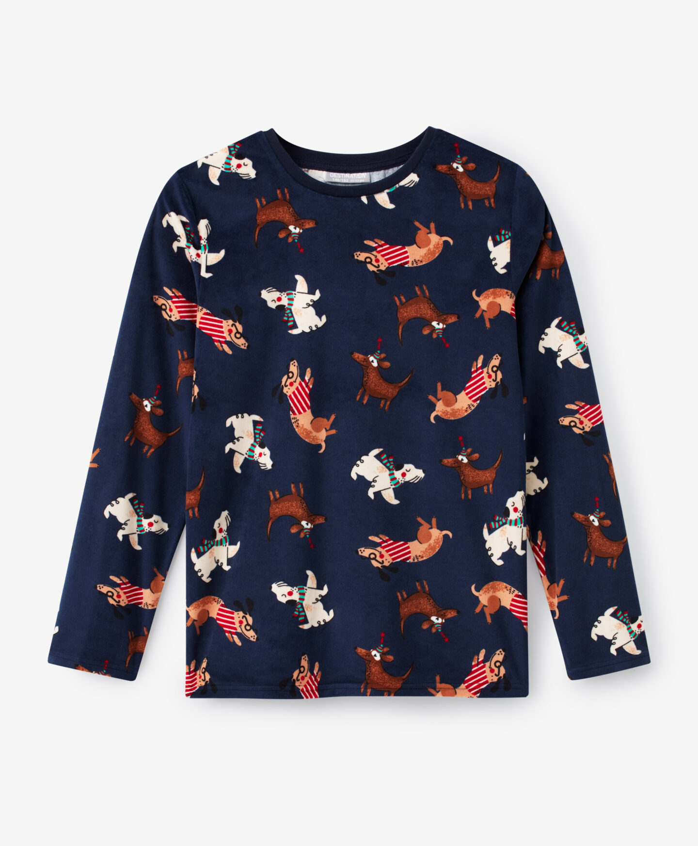 Velūra pidžama ar suņu motīvu nodrošina komfortu miegam un kustību brīvību. Izgatavota no mīksta un patīkama velūra, tie ir ideāli piemēroti vēsākām naktīm. Tā garantē siltumu un mājīgumu. Rotaļīgie raksti ar suņu motīviem liks ikvienam vēlēties to valkāt pirms gulētiešanas.