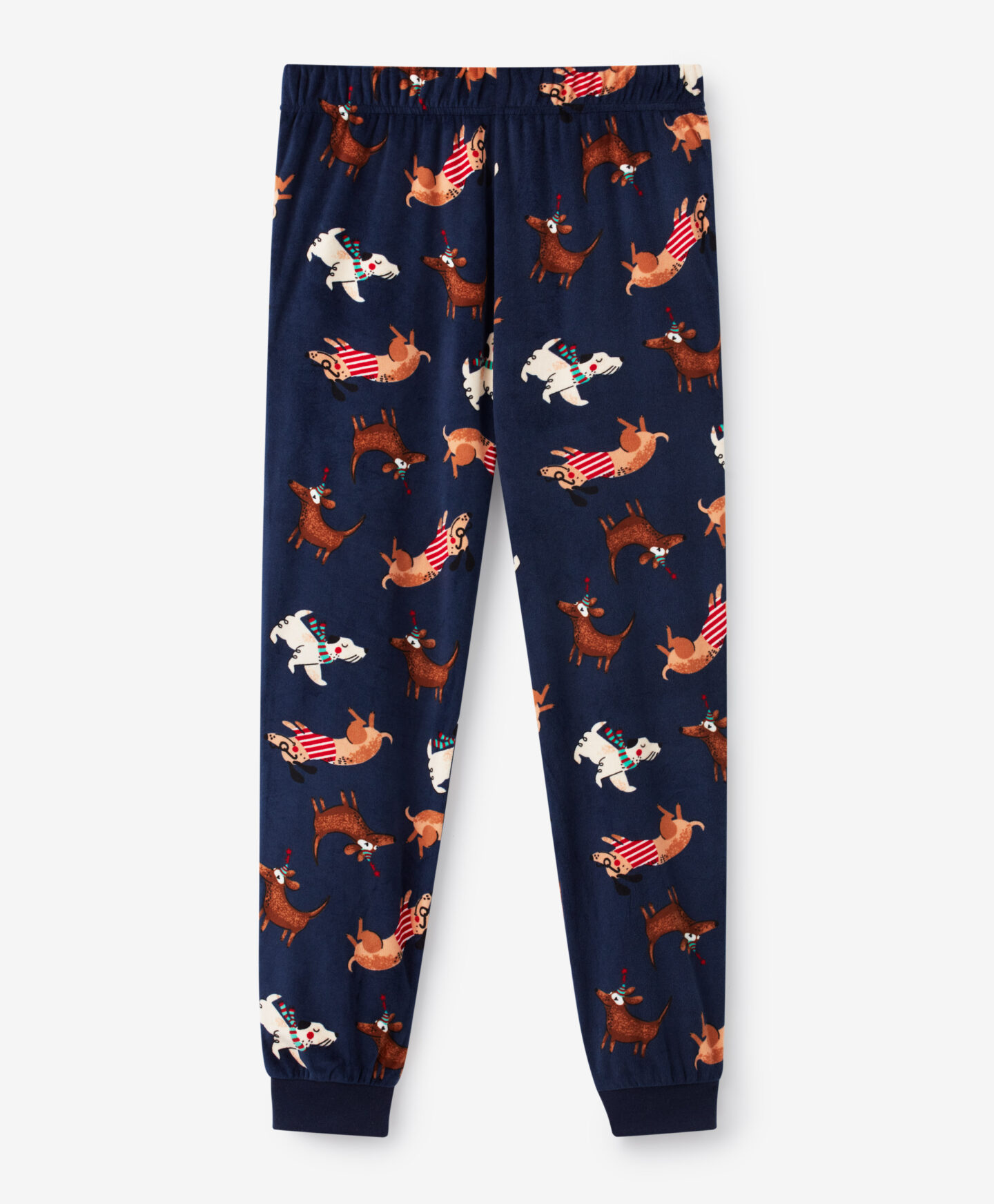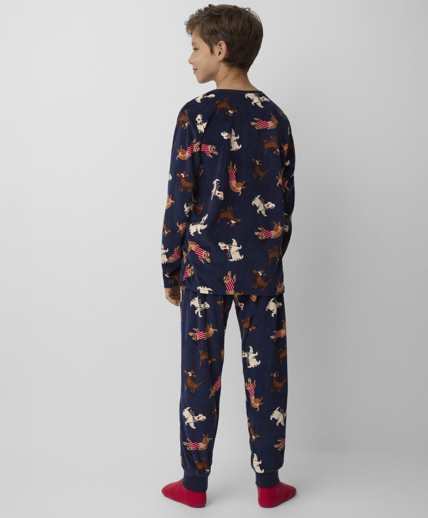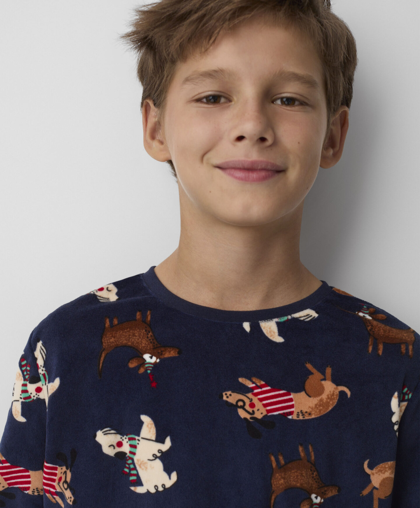 Velūra pidžama ar suņu motīvu nodrošina komfortu miegam un kustību brīvību. Izgatavota no mīksta un patīkama velūra, tie ir ideāli piemēroti vēsākām naktīm. Tā garantē siltumu un mājīgumu. Rotaļīgie raksti ar suņu motīviem liks ikvienam vēlēties to valkāt pirms gulētiešanas.