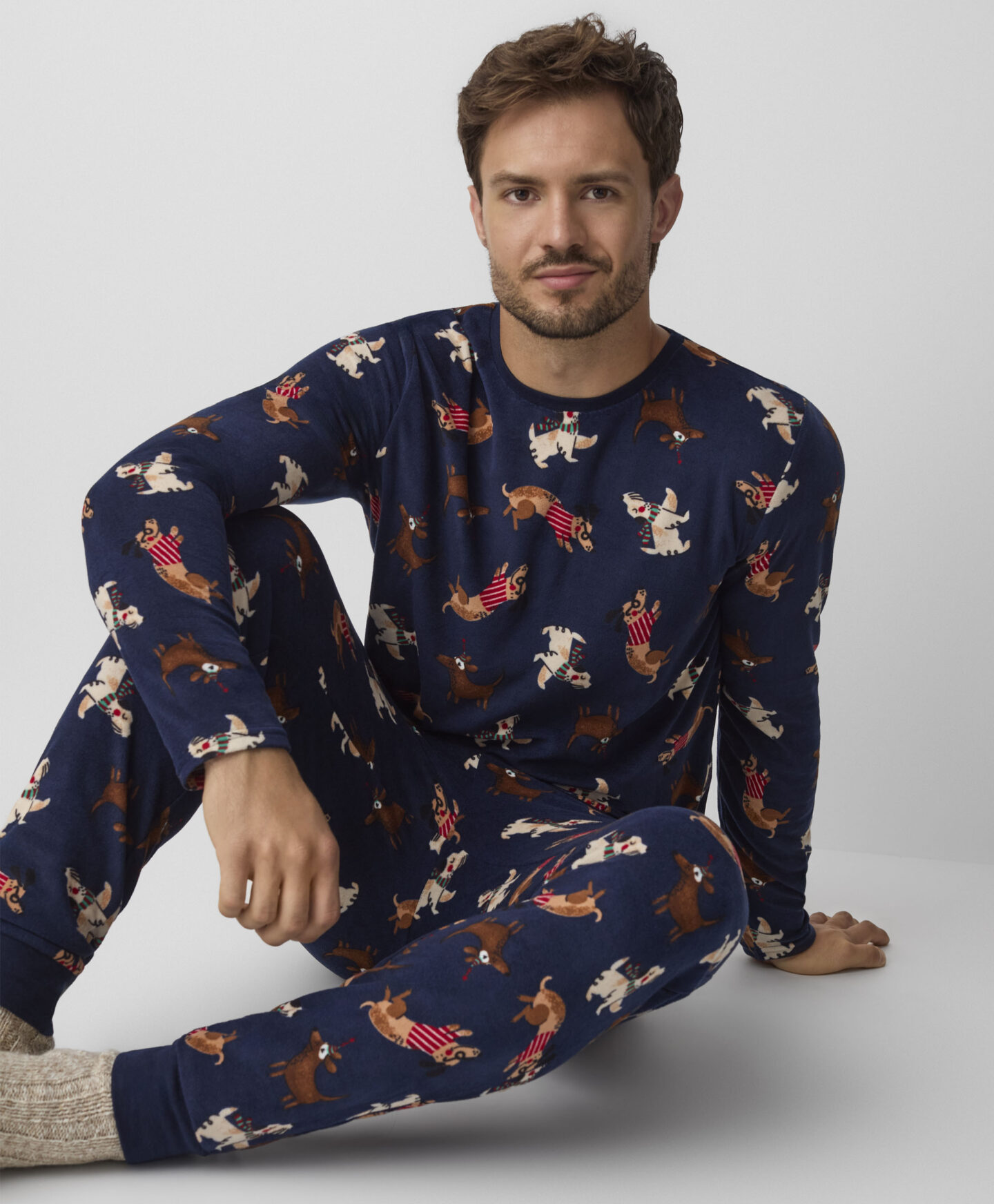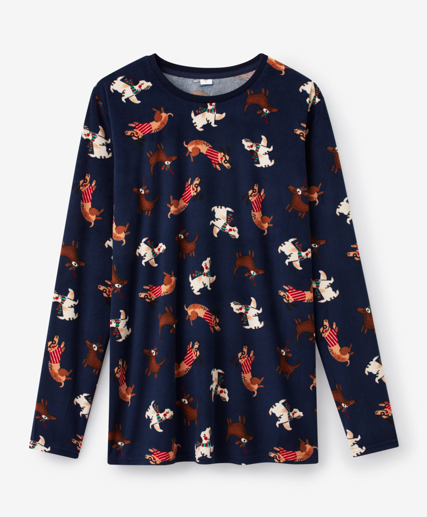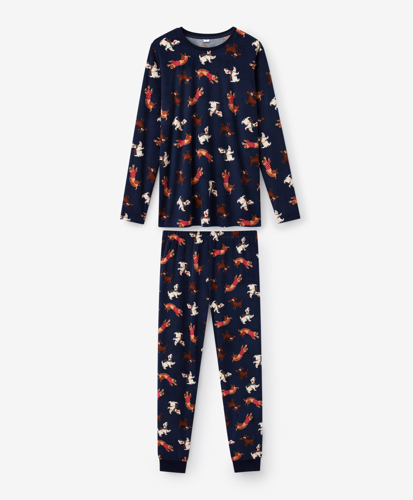 Velūra pidžama ar suņiem ir ideāli piemērota vēsākām dienām. Izgatavota no mīksta un patīkama pieskārienam velūra, tā nodrošina siltumu, komfortu miegam un mājīgumu. Rotaļīgie raksti ar suņu motīviem liks ikvienam vēlēties to valkāt pirms gulētiešanas. Ideāli piemērota šo četrkājaino draugu cienītājiem.
