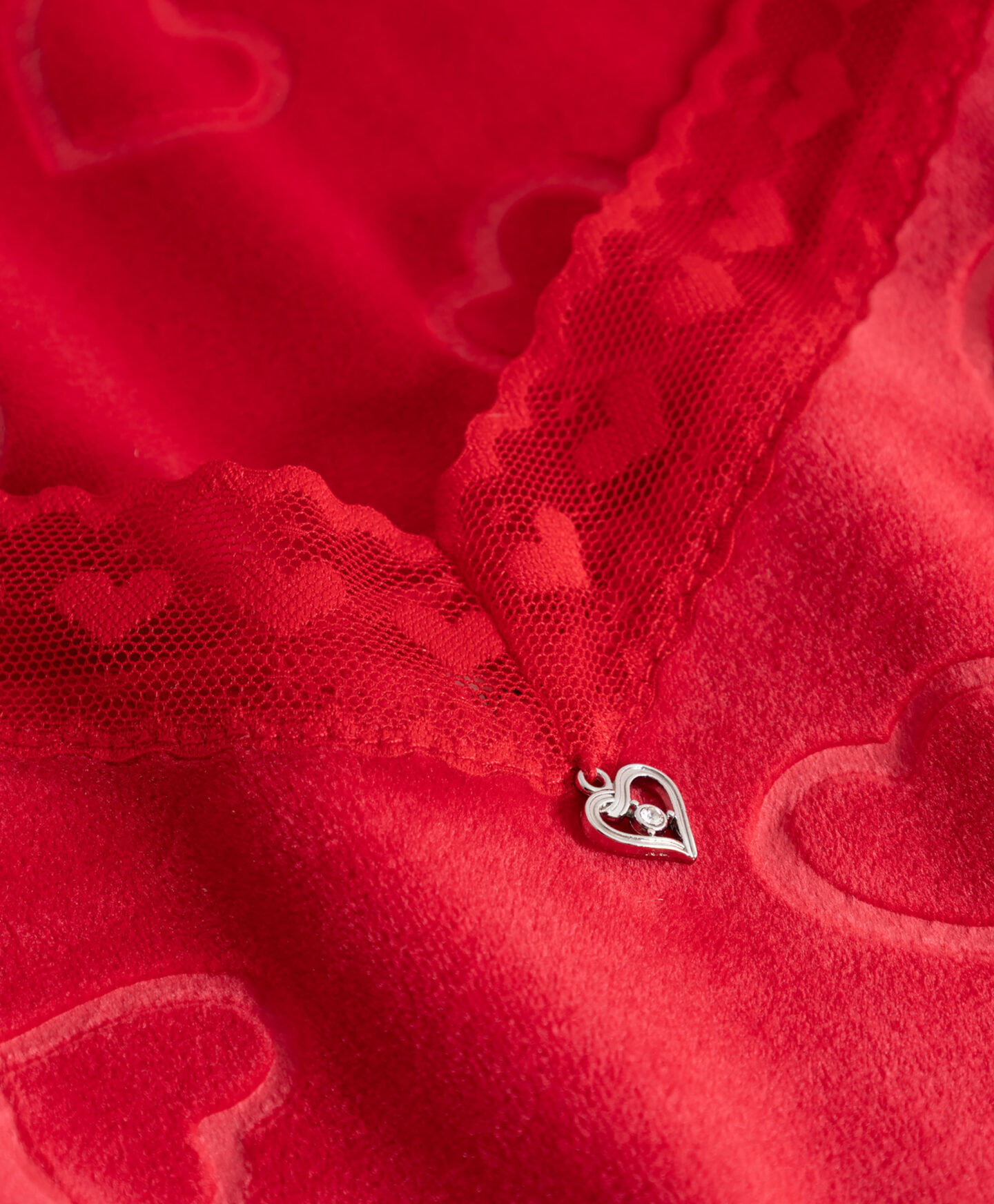 Sarkanā velūra pidžama ar mežģīnēm un sirds formas reljefu liks iemīlēt Valentīndienu. Komplektā ietilpst krekliņš ar šaurām lencēm un šorti, kas ideāli piestāv, izceļot figūras priekšrocības. Tā ir lieliska ideja dāvanai, ko pasniegt mīļotajam cilvēkam. Piedāvājumā ir pieejami divi krāsu varianti.