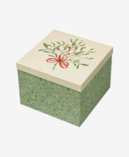 Zaļajai kartona kastei ir dekoratīva apdruka svētku noskaņā. Tā ir praktiska un estētiska, tāpēc lieliski piemērota, lai kastē iesaiņotu pārsteigumus mīļajiem. Dāvanas šādā iepakojumā izskatās īpaši un rada prieku jau no pirmā acu uzmetiena.