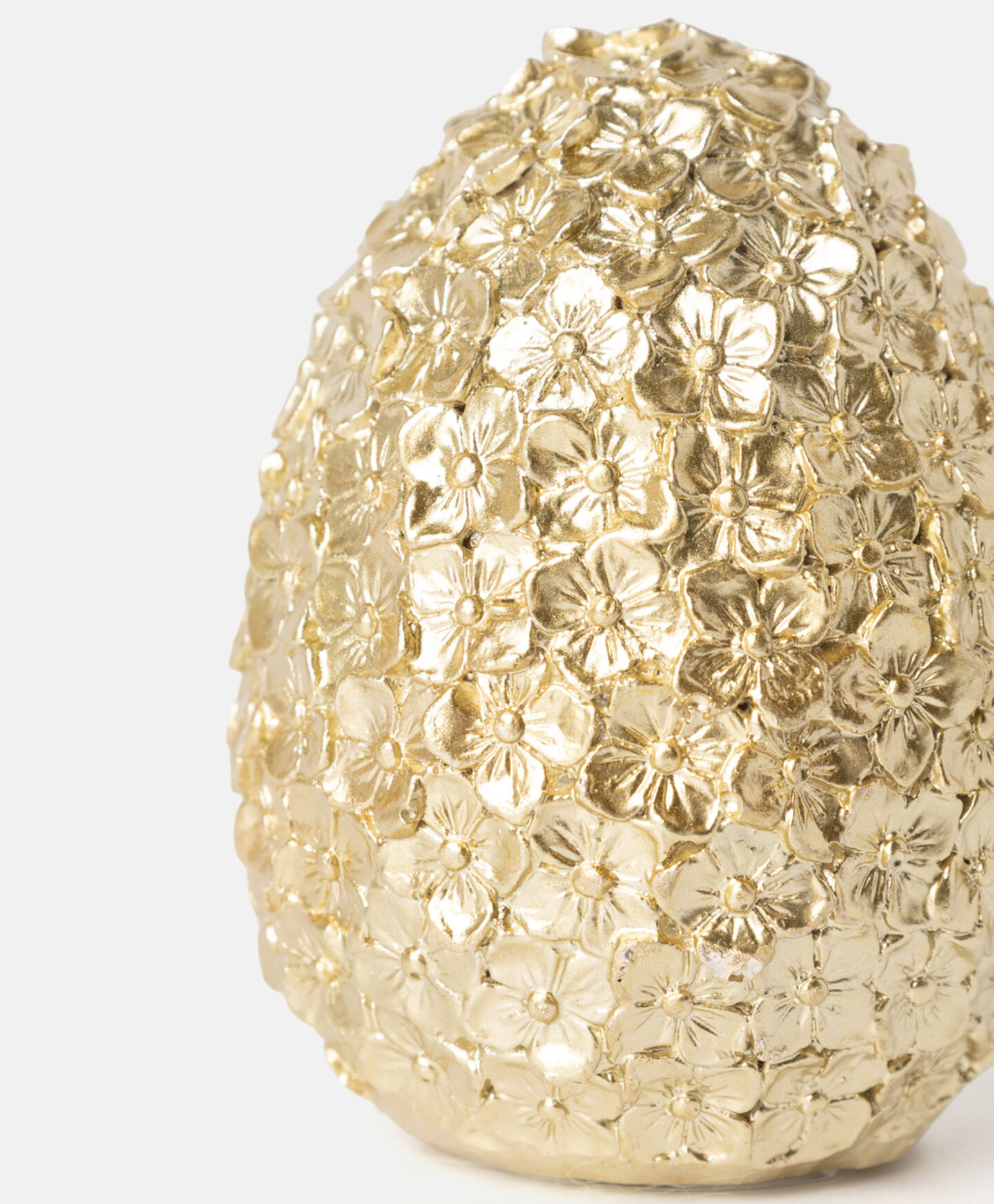 Dekoratīvā zelta ola izgatavota no polirezīna, tā ir elegants akcents, kas piesaista uzmanību ar mirdzošo apdari. Polirezīns ir izturīgs, viegls un ilgi kalpojošs materiāls, kas ir izturīgs pret bojājumiem, skrāpējumiem un krāsas izmaiņām, nodrošinot, ka dekorācija saglabās labu izskatu vēl ilgi.
