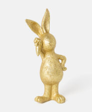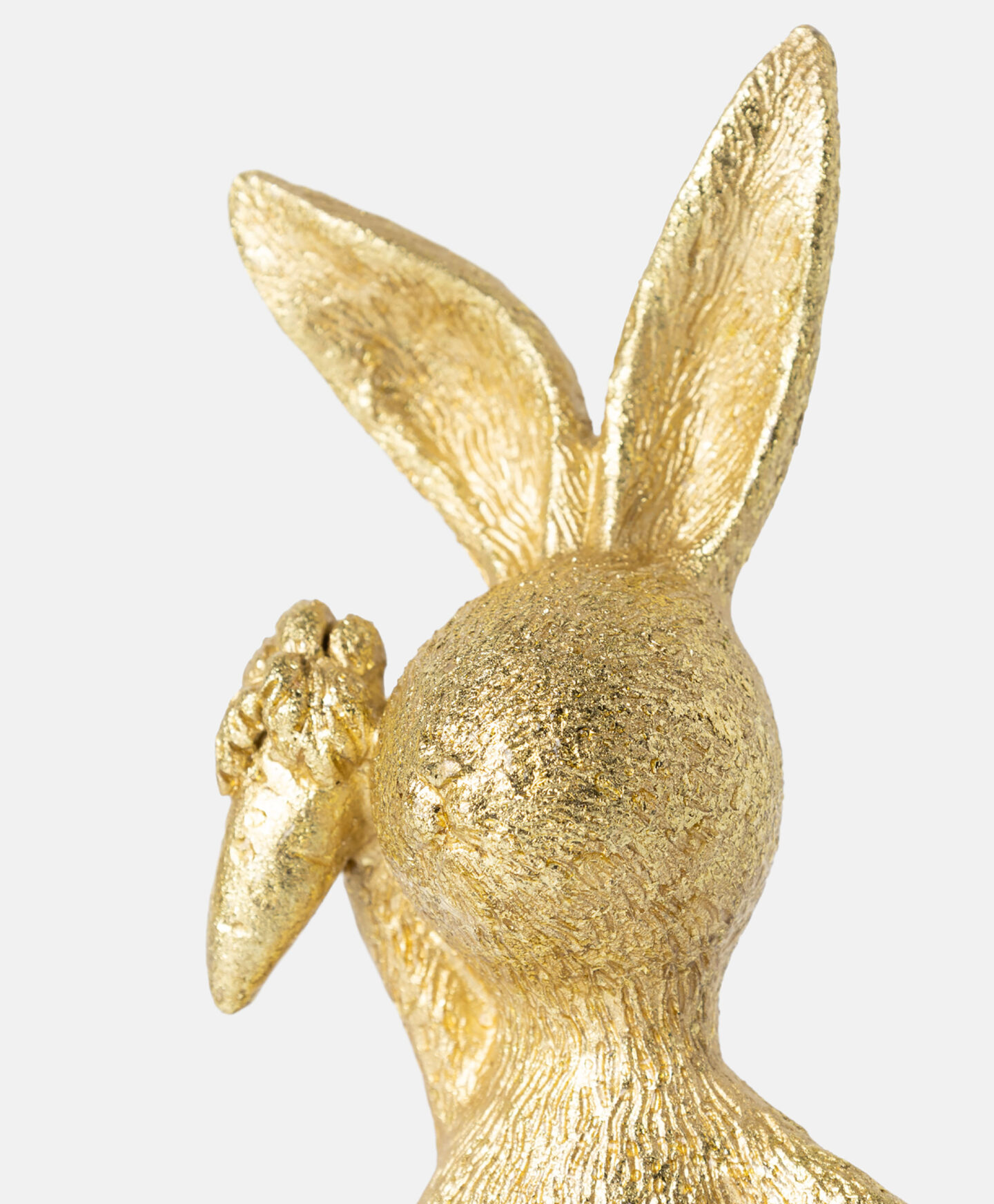 Zelta krāsas polirezīna zaķis ar burkānu piesaista uzmanību ar tā eleganto izskatu. Polirezīns ir viegls un izturīgs materiāls, ko īpaši neietekmē laiks un laikapstākļi, kas nodrošina figūriņas ilgstošu kvalitāti. Zaķis ir ideāls tiem, kas meklē smalkus, gaumīgus akcentus. Pieejami dažādi dizaini.