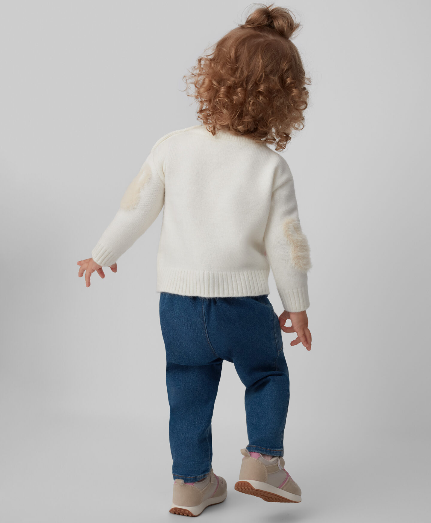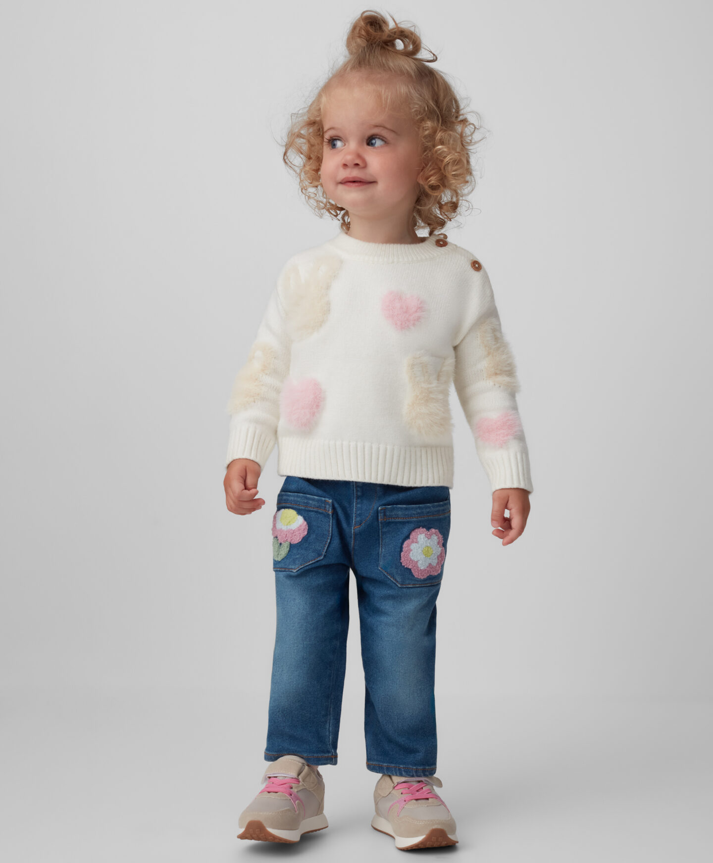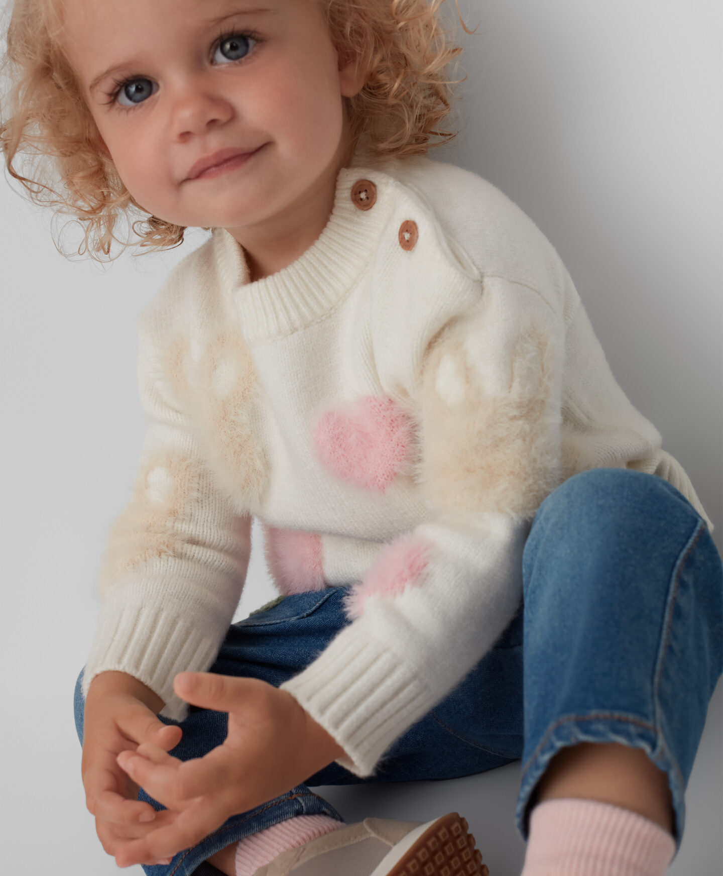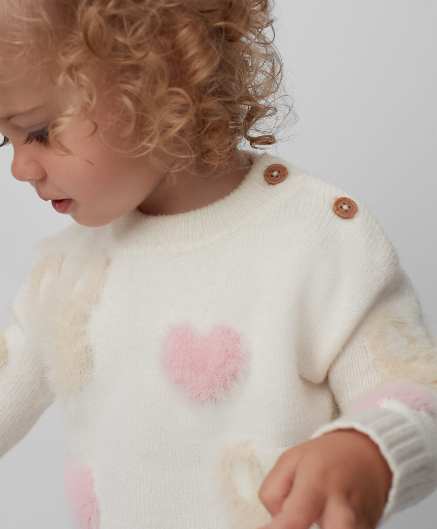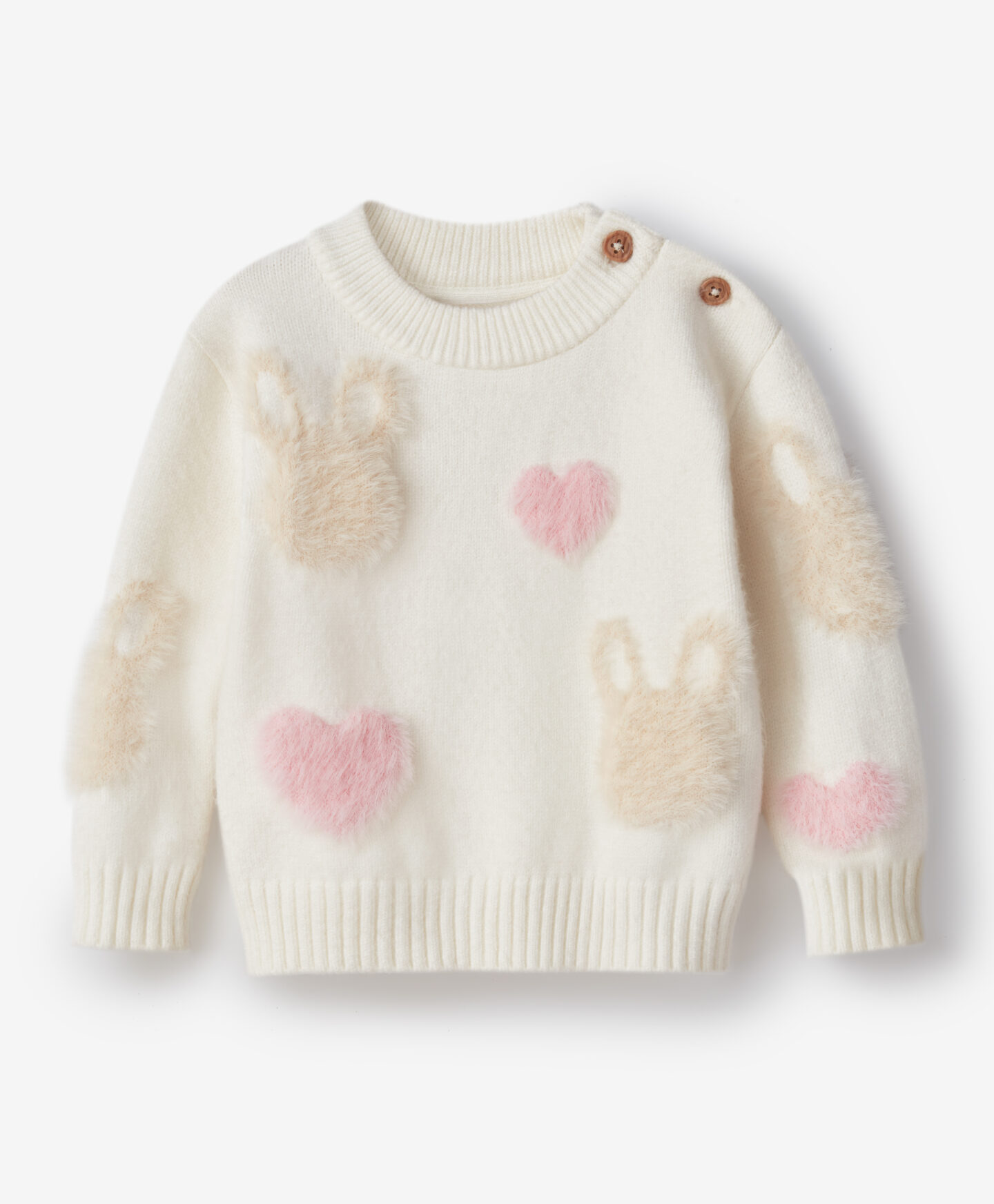 Zīdaiņu džemperis ar pogu aizdari ir ērta izvēle ikdienai. Pogu aizdare atvieglo mazuļa ģērbšanu, bet zaķēnu un sirsniņu raksts piešķir šarmu jebkuram tērpam. Džemperis ir silts, mīksts un patīkams ādai.