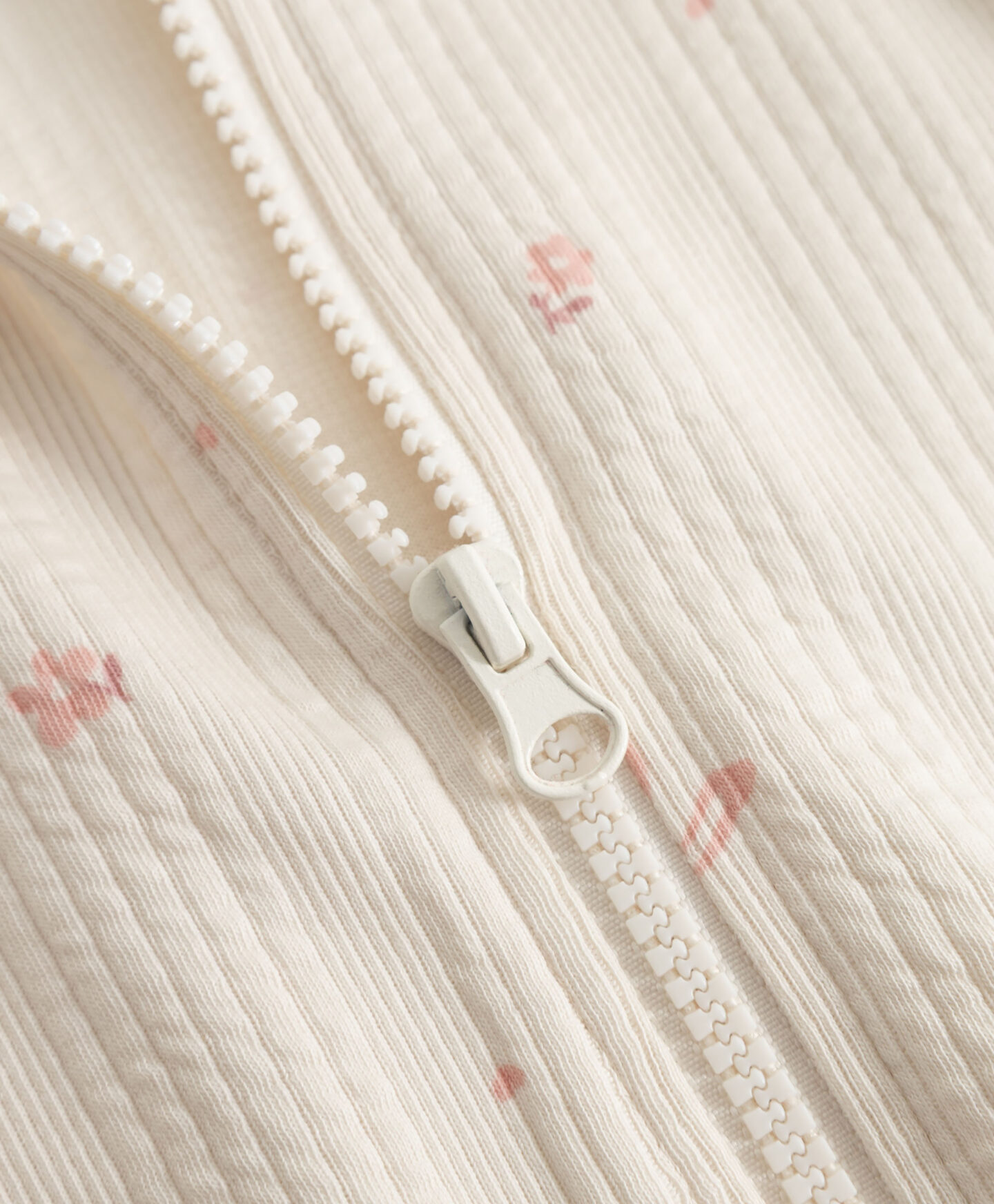 Zīdaiņu džemperi ar volāniem var aizvērt ar ērtu rāvējslēdzēju, kas atvieglo mazulīša apģērbšanu. Elastīgās aproces nodrošina bērnam siltumu un komfortu. Burvīgais zaķu raksts piešķir prieku kopā pavadītajam laikam un izskatās skaisti fotogrāfijās. Mīkstais, augstas kvalitātes kokvilnas audums ir maigs mazulīša jutīgajai ādai, šāds apģērbs ir ideāli piemērots pirmajiem komplektiem.