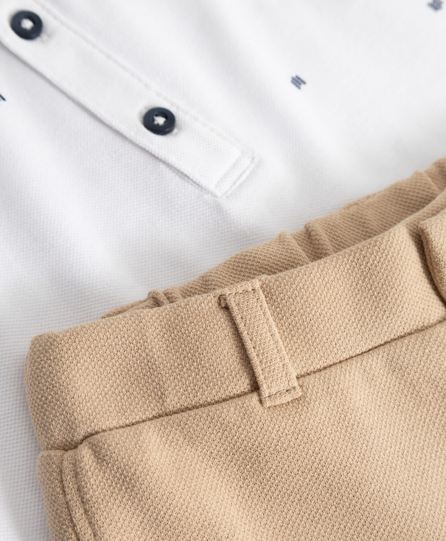 Šajā zīdaiņu komplektā ietilpst ērtas bikses un polo krekls. Tas ir gatavs tērps mazulim, ko vēsākās dienās var papildināt ar kolekcijas jaku. Mīkstais, ādai draudzīgais materiāls padara to par ideālu izvēli no dzimšanas brīža. Šis komplekts ir ideāls ikdienas valkāšanai un īpašiem notikumiem. Tā ir arī lieliska ideja dāvanai, ko pasniegt stilīgam mazulim.