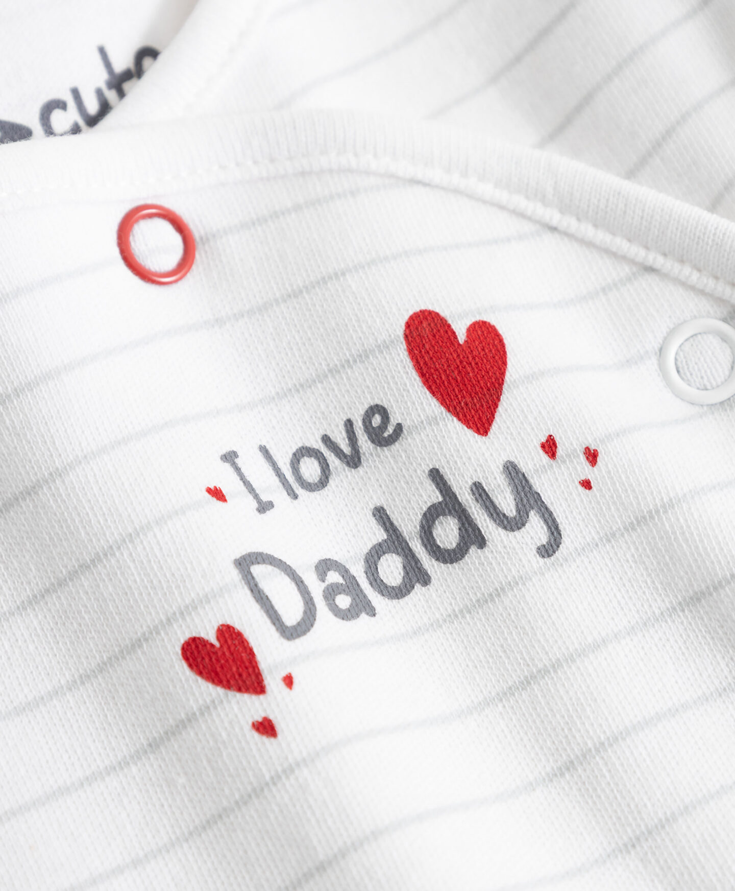 100% kokvilnas zīdaiņu pidžama ar uzrakstu ir ideāli piemērota gan Valentīndienas tērpam, gan ikdienas aktivitātēm. Pateicoties garām piedurknēm un kājām, mazulis būs siltumā, turklāt mīkstais materiāls maigi ieskauj jutīgo ādu. Spiedpogu aizdare atvieglo apģērbšanu un autiņbiksīšu maiņu.