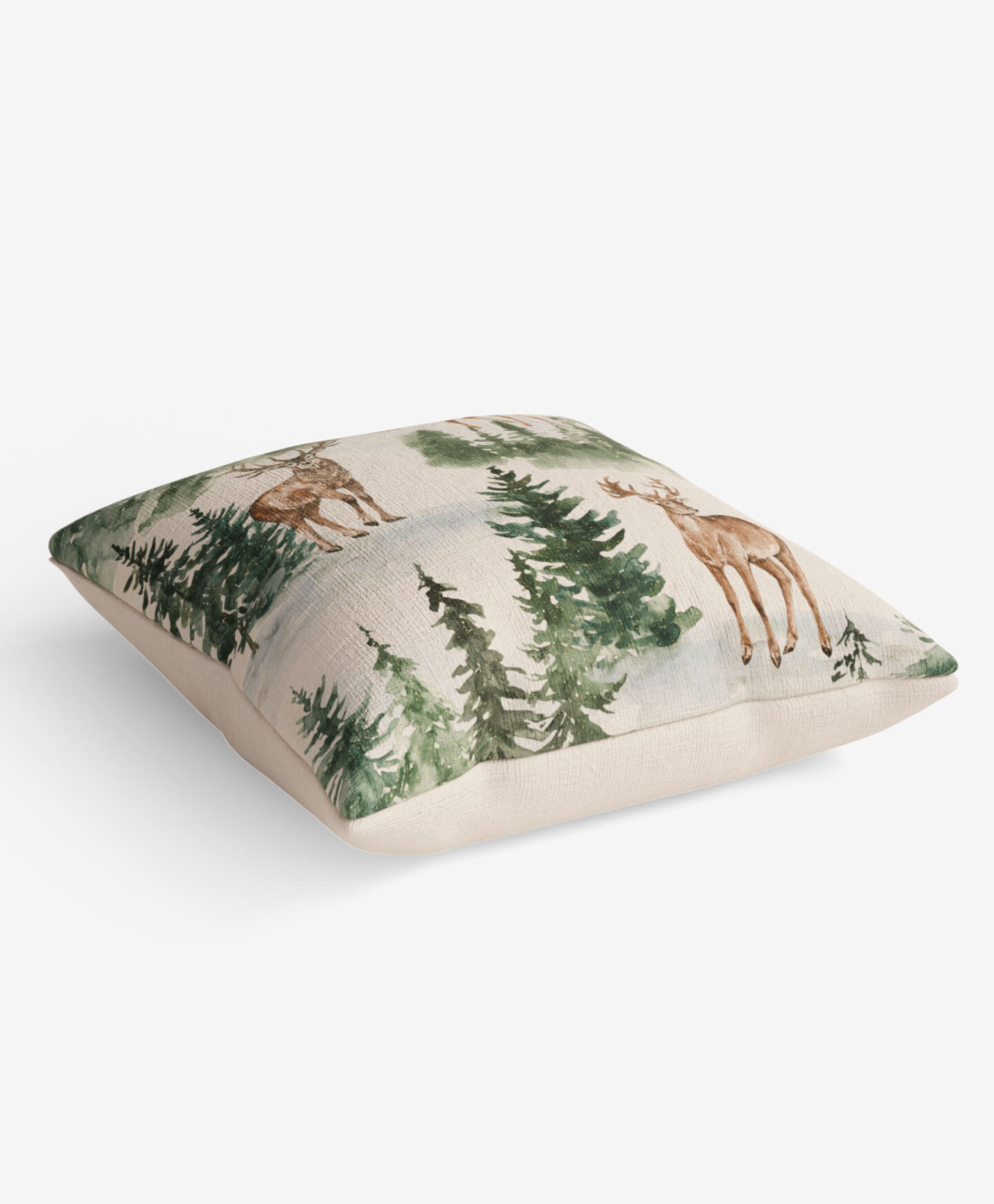 Dekoratīvais ziemas meža spilvens ar Ziemassvētku eglēm un briežiem iepriecina ar skaisto rakstu. Tas ir papildinājums, kas labi kalpos gan kā dekoratīvs elements, gan kā ērts atbalsts relaksācijas laikā.