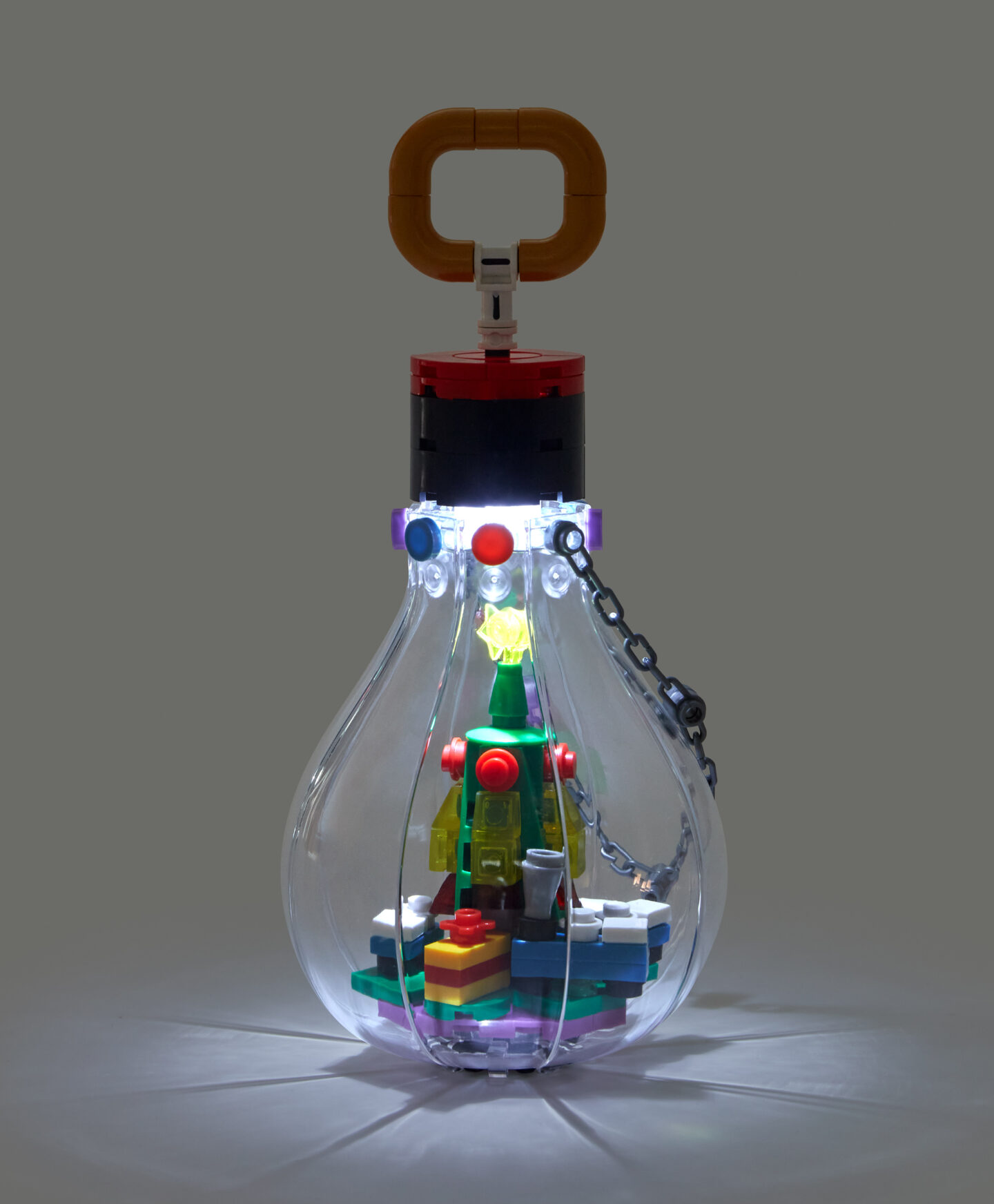 Ziemassvētku spuldzīte ar klucīšiem ar eglīti ir dekorācija, kas apvieno gaismu un Ziemassvētku simbolu. Iekšpusē atrodas miniatūra eglīte, kas, iedegta, rada siltu un mājīgu atmosfēru. Tas ir neliels akcents, kas lieliski papildina Ziemassvētku rotājumus mājās, ienesot interjerā pasaku atmosfēru.