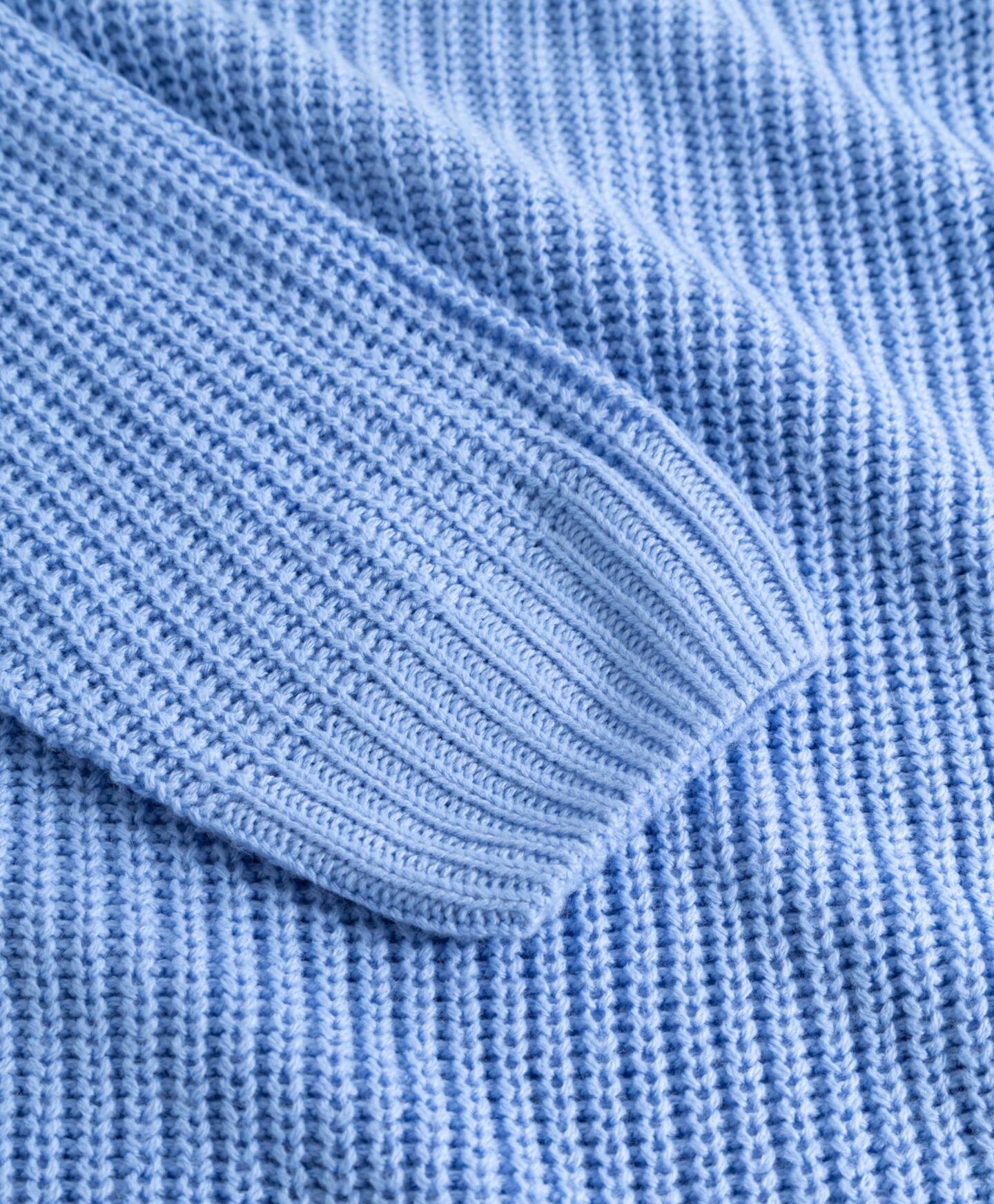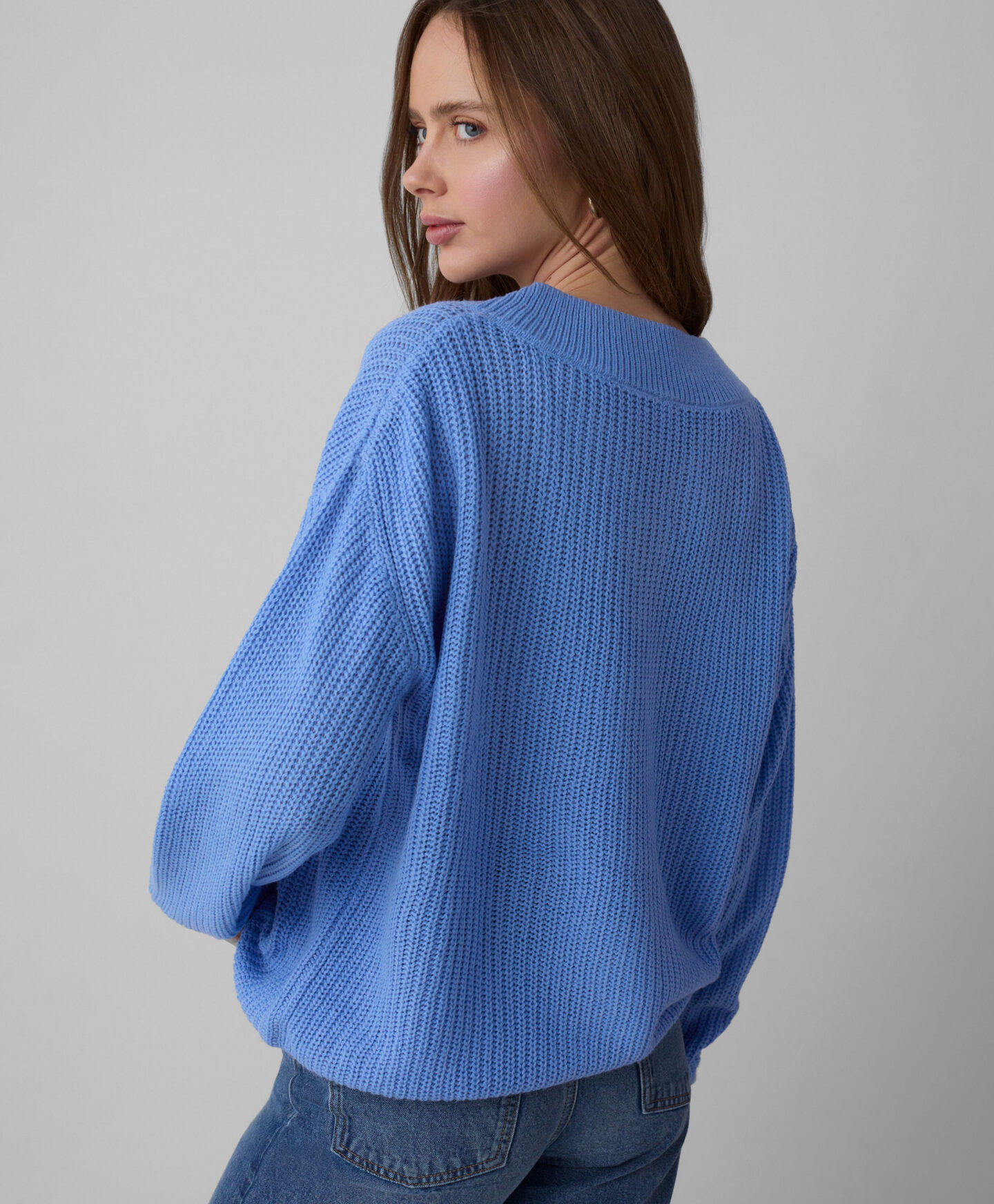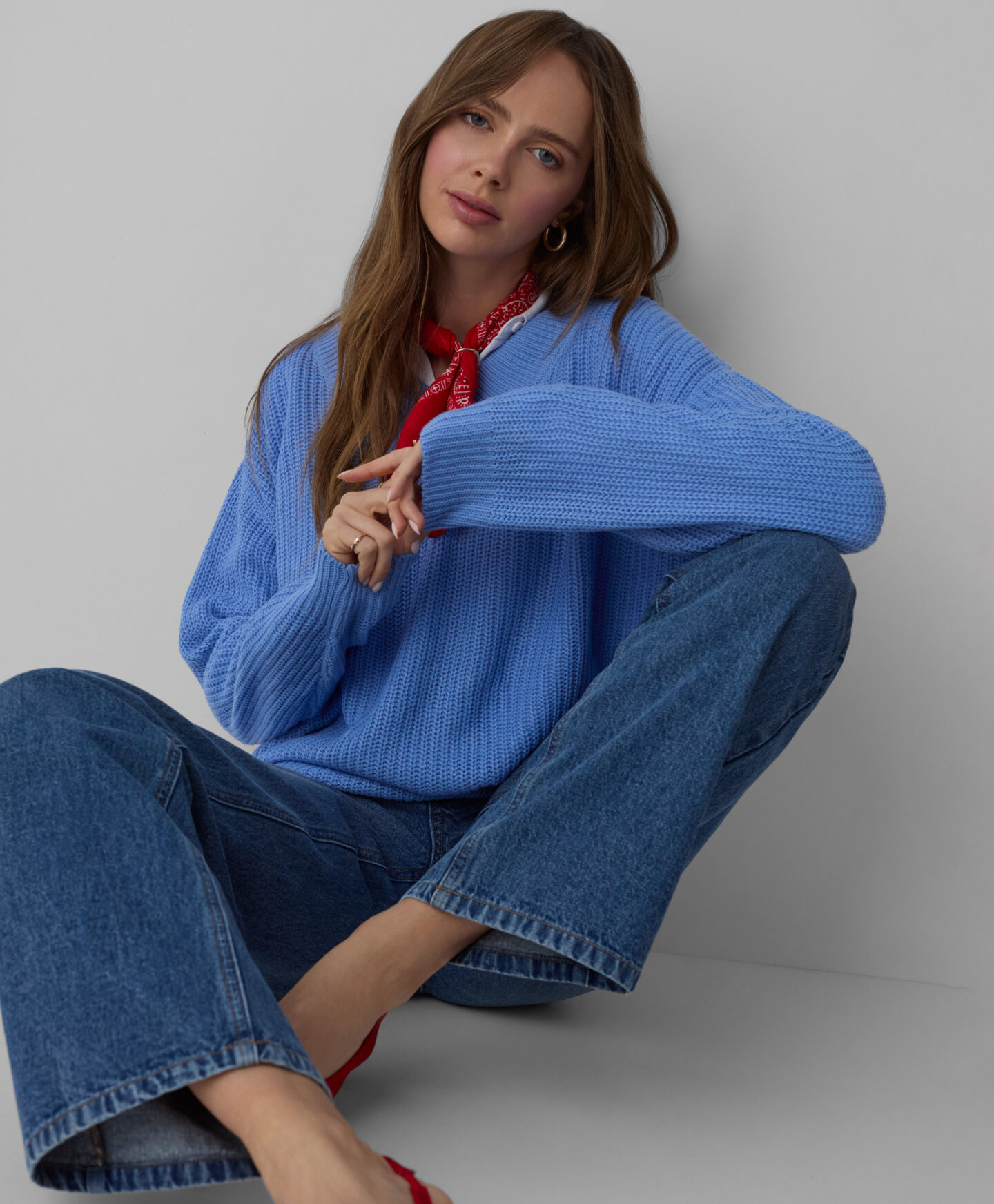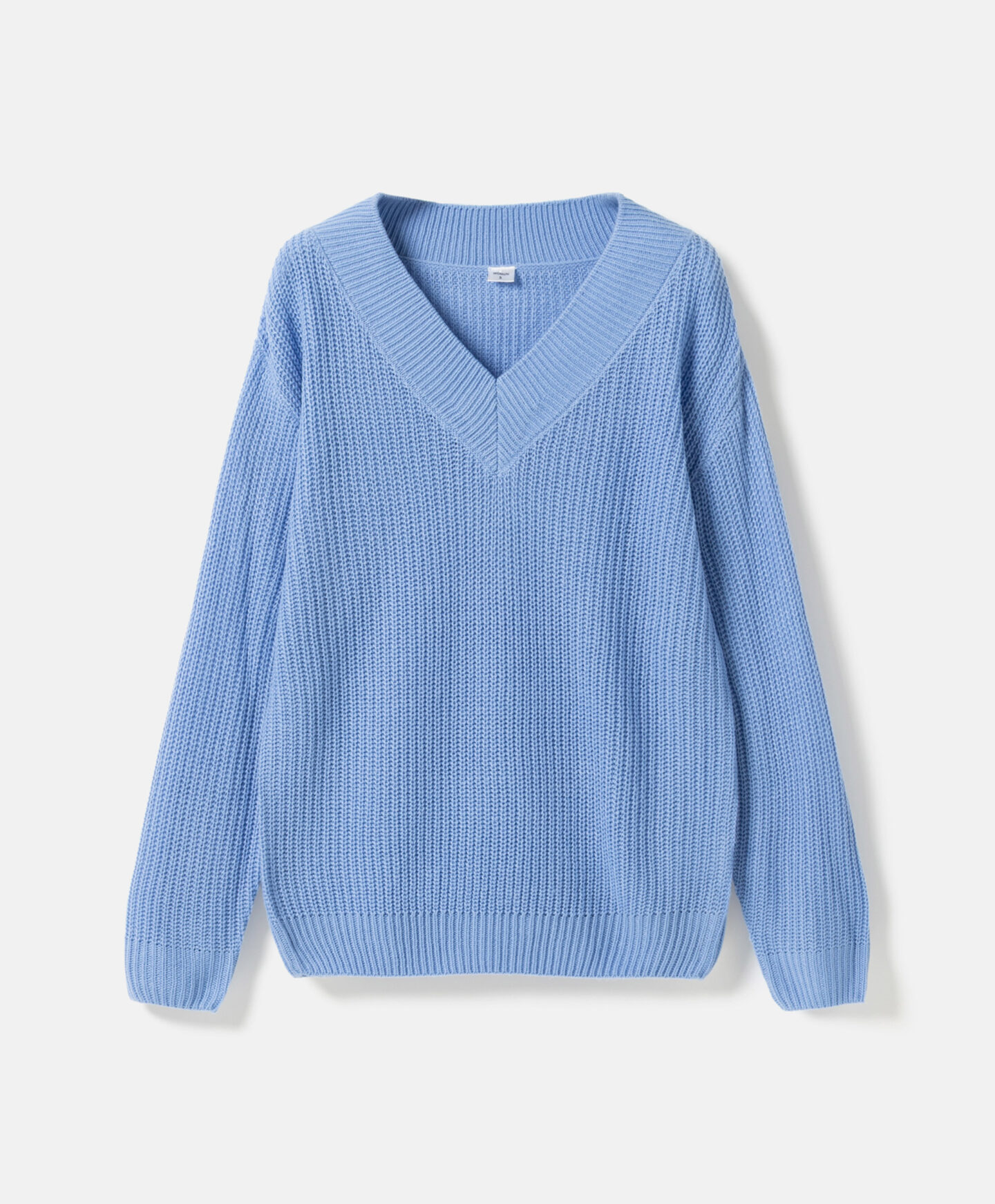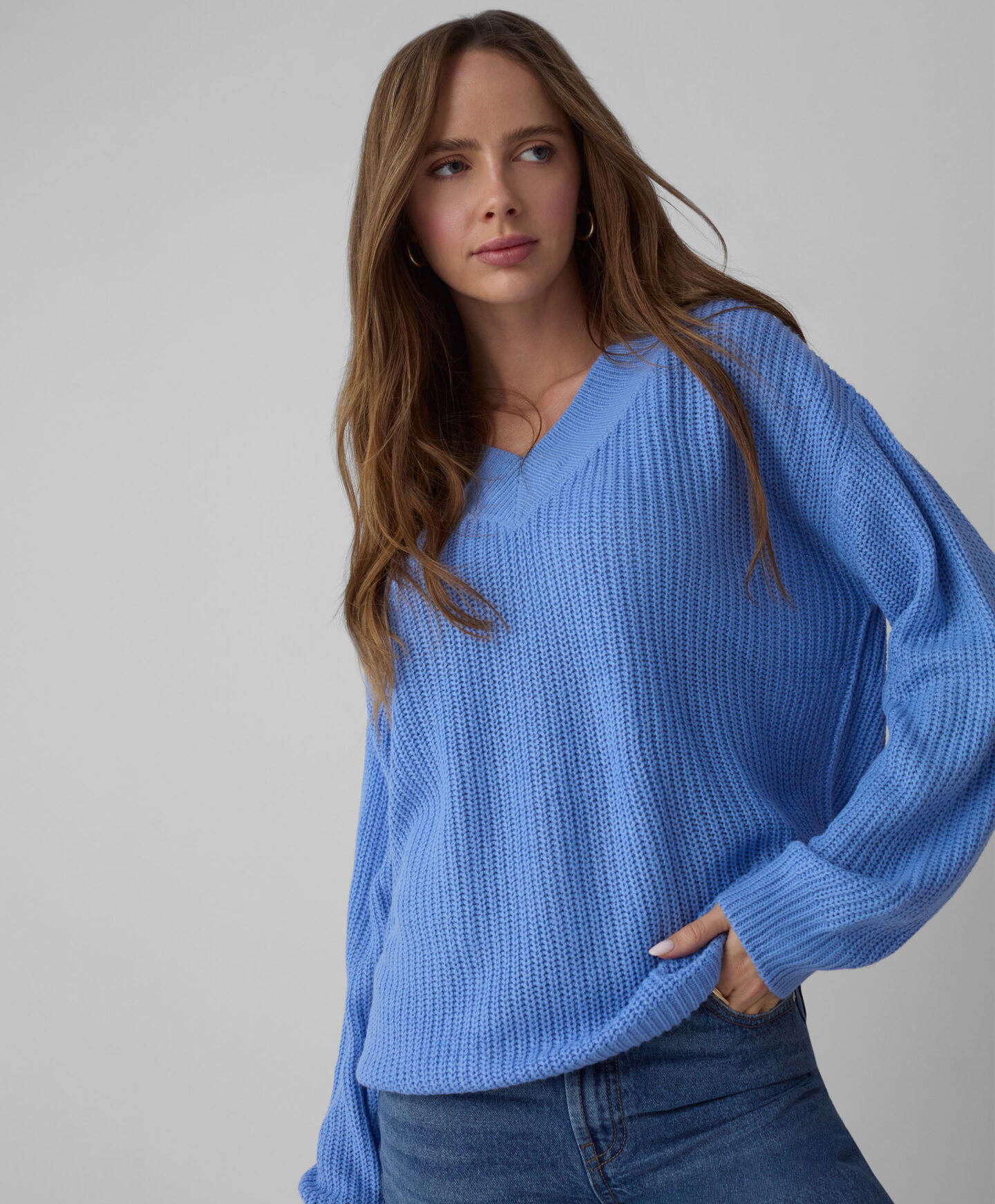 Zils džemperis ar V veida izgriezumu ir ideāls ikdienas valkāšanai. Tā ir lieliska izvēle, ko uzvilkt virs T-krekla vai eleganta krekla. Izgriezums akcentē kakla līniju un padara kaklu slaidāku, bet pītais adījums piešķir apģērbam raksturu. Džemperis ir silts, mīksts un ļoti elegants. Pieejami divi modeļi.